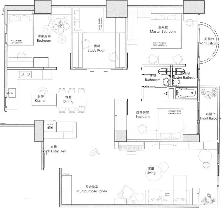 为了实现开放式厨房的愿景,果断拆除了原有的隔墙,中岛与餐桌布置成回字形排列,营造出宽敞的厨房餐厅区域。