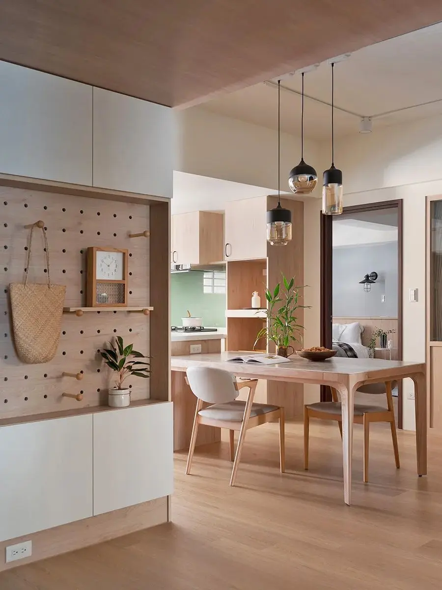 左边定制柜上,洞洞板增加了悬挂物品的灵活性。白色和木色的搭配给人和谐、舒适的感觉。