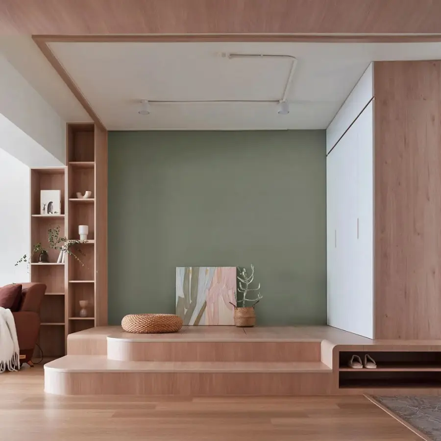 多功能区的台阶与穿鞋椅融为一体,绿色背景营造出宁静的氛围,仿佛置身于柔软的草地上。