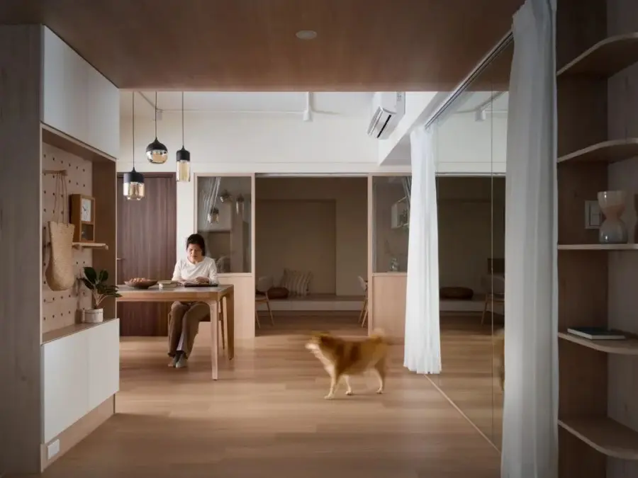 木质餐桌成为家人聚餐和独处时的温馨场所。走廊贴上大片镜子,为喜欢跳舞的女儿提供了挥洒舞姿的空间。