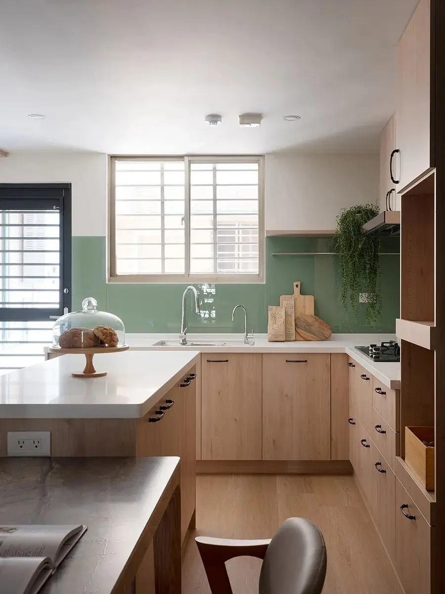 厨房炉灶区用了绿色玻璃,高柜简洁不拥挤,中岛选用耐高温的石英石,配了抽拉式电器柜,方便收纳和清洁。
