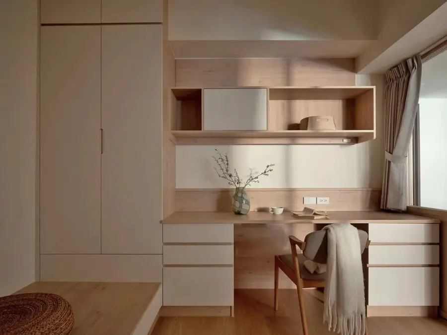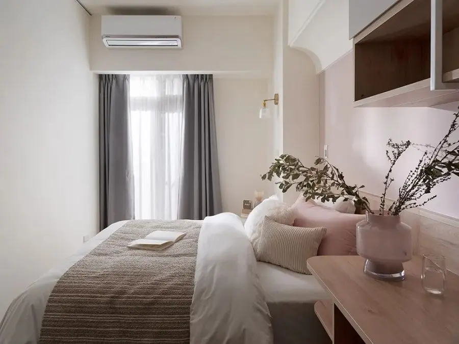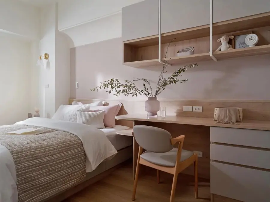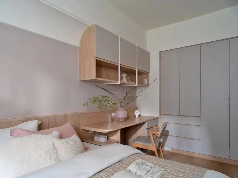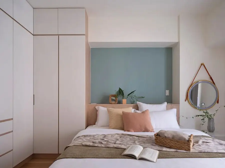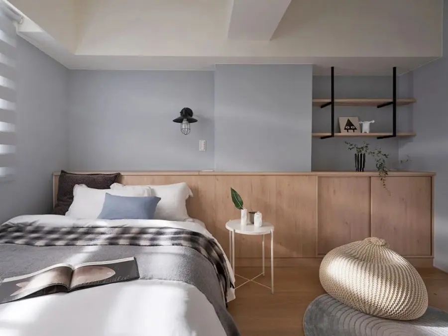 主卧整体选择低饱和度的颜色,床头设置了与上梁宽度相相同的小平台。搭配低环保定制柜,打造出安心的收纳空间。