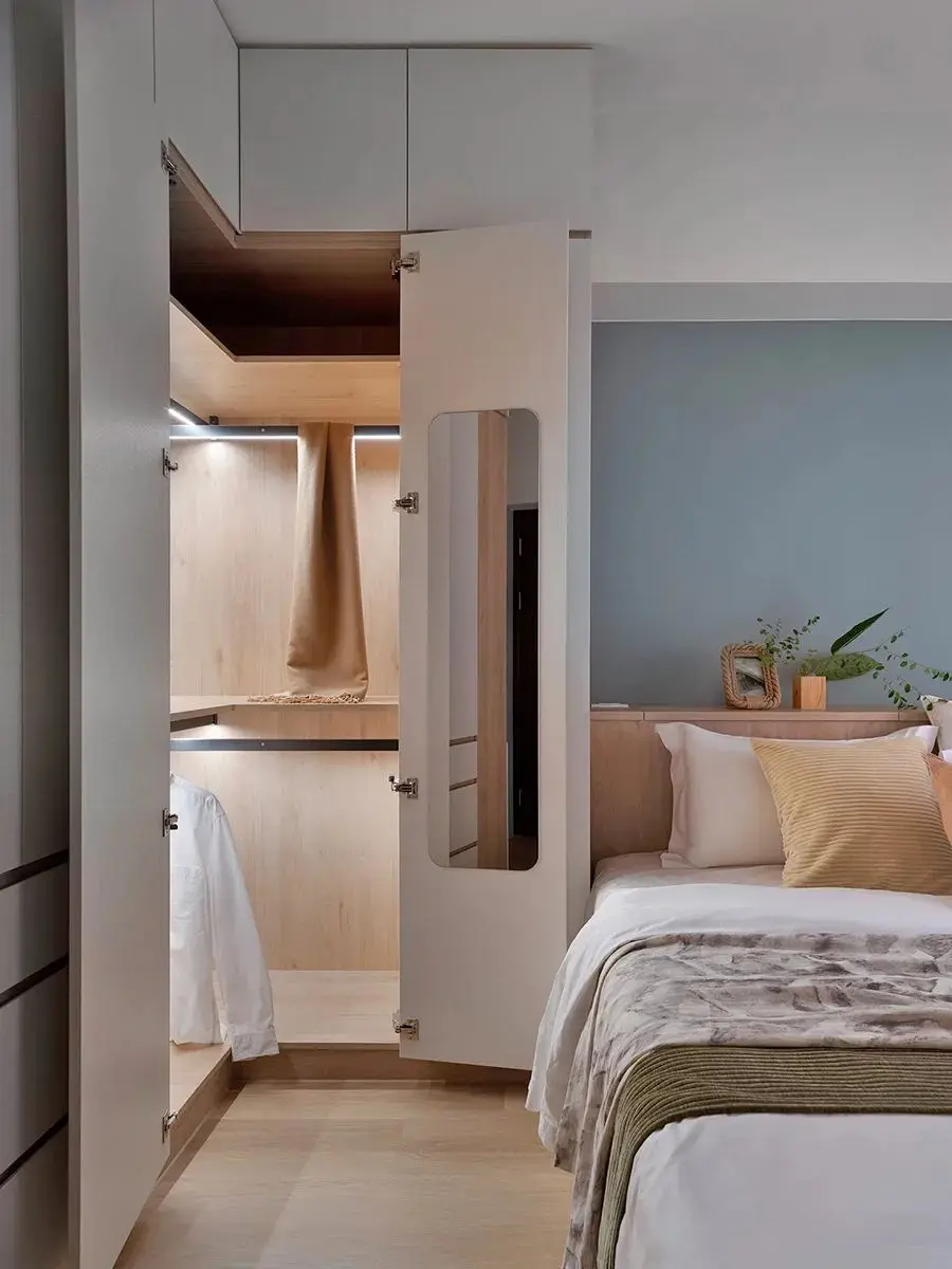 衣柜内的吊杆配备了红外线感应式照明,方便取用衣物。