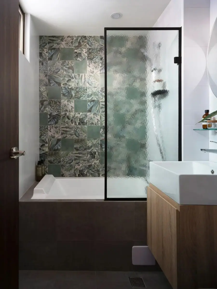 主卫浴缸墙上贴了植物图案的花砖,仿佛置身于热带雨林;客浴则安装了四合一暖风机,加强了通风、除湿效果。