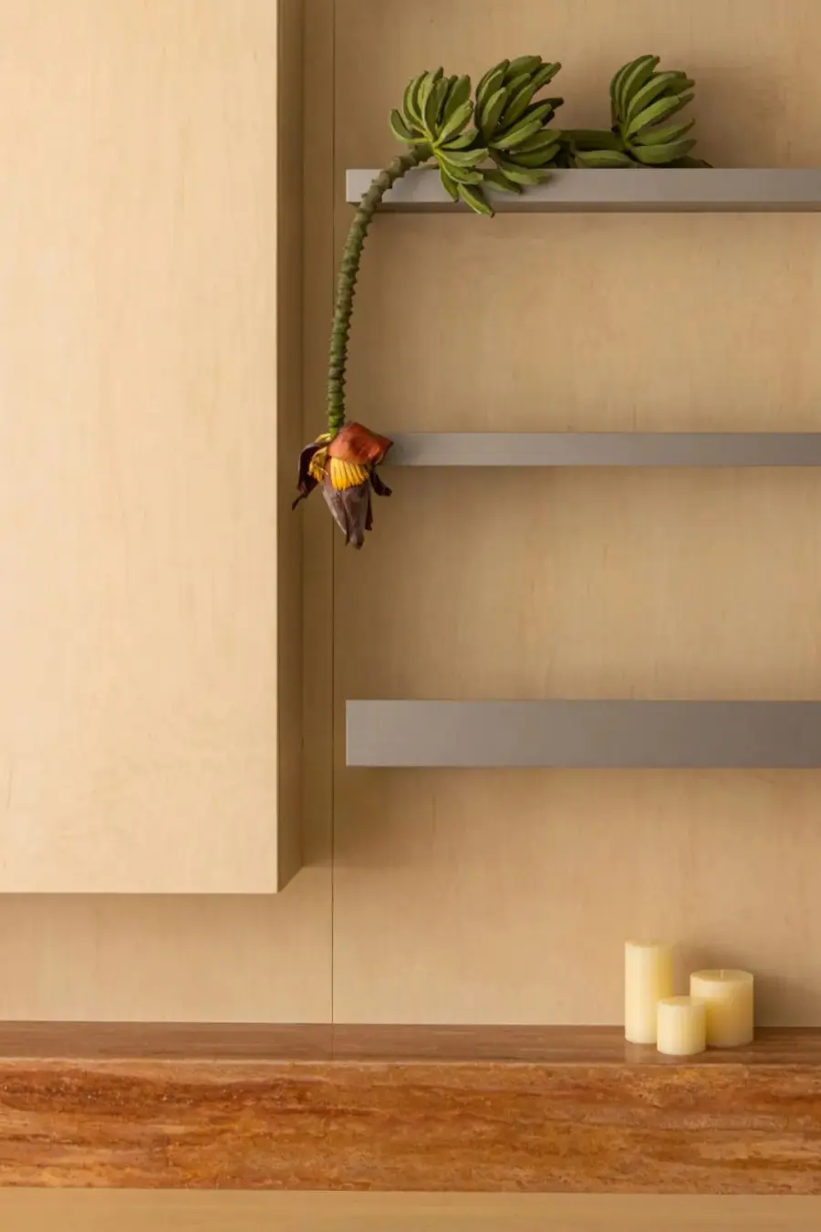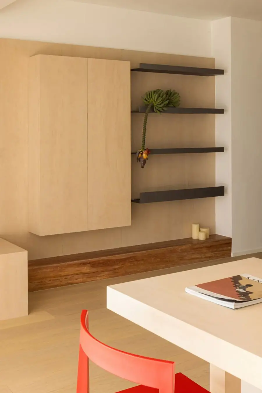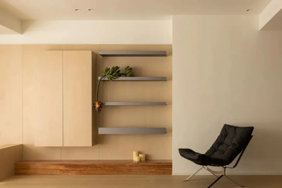 以微末之姿浸润家居主调,浑俗和光、静静缓缓便足以主控全场,颇有闲云野鹤般的悠然自得之感。借以承重墙作为空间结构基调,以体块穿插、功能式排布、洄游式动线,将家居的动势、空间的灵动、不拘一格的随性洒脱尽现。入墙式整面柜体满足家居收纳以保证空间的纯粹,开放格的阵列式排布满足不同的收纳需求的同时,亦在把控着空间的节奏与秩序美感。