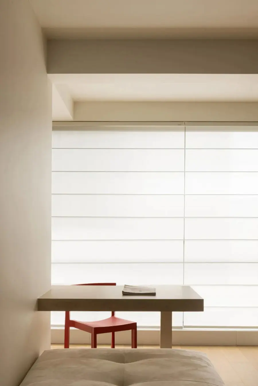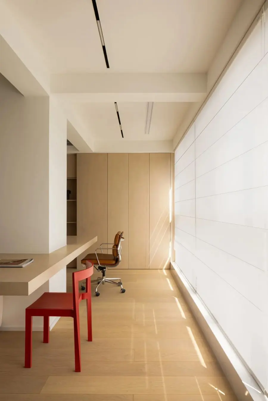 居者需要读书办公的区域,可以接受开放式,去常规化的客厅将工作区也一并纳入其中,公区的功能多元而契合。父母办公、孩子阅读手工都可在此,足够长的台面亦可满足亲子的同时使用。契合家庭成员的生活模式而进行的功能布置,有效提高处事效率,空间上的合理布局达到时间上的统筹高效、情感上的密切连接。