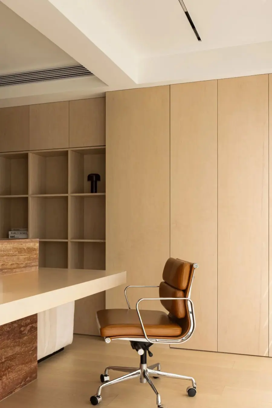 行为模式下的家居形态,契合人物的空间组合方才是无他之设计。去常规化客厅+敞开式书房+环形动线,自由式公区归还居者的理想家居状态。原木色与米白色的落笔,温柔细腻的语调在浅浅吟唱;和筋骨感空间结构的同塑下,外柔中刚的中庸之调旋律悠扬,落笔之下,自有天地。
