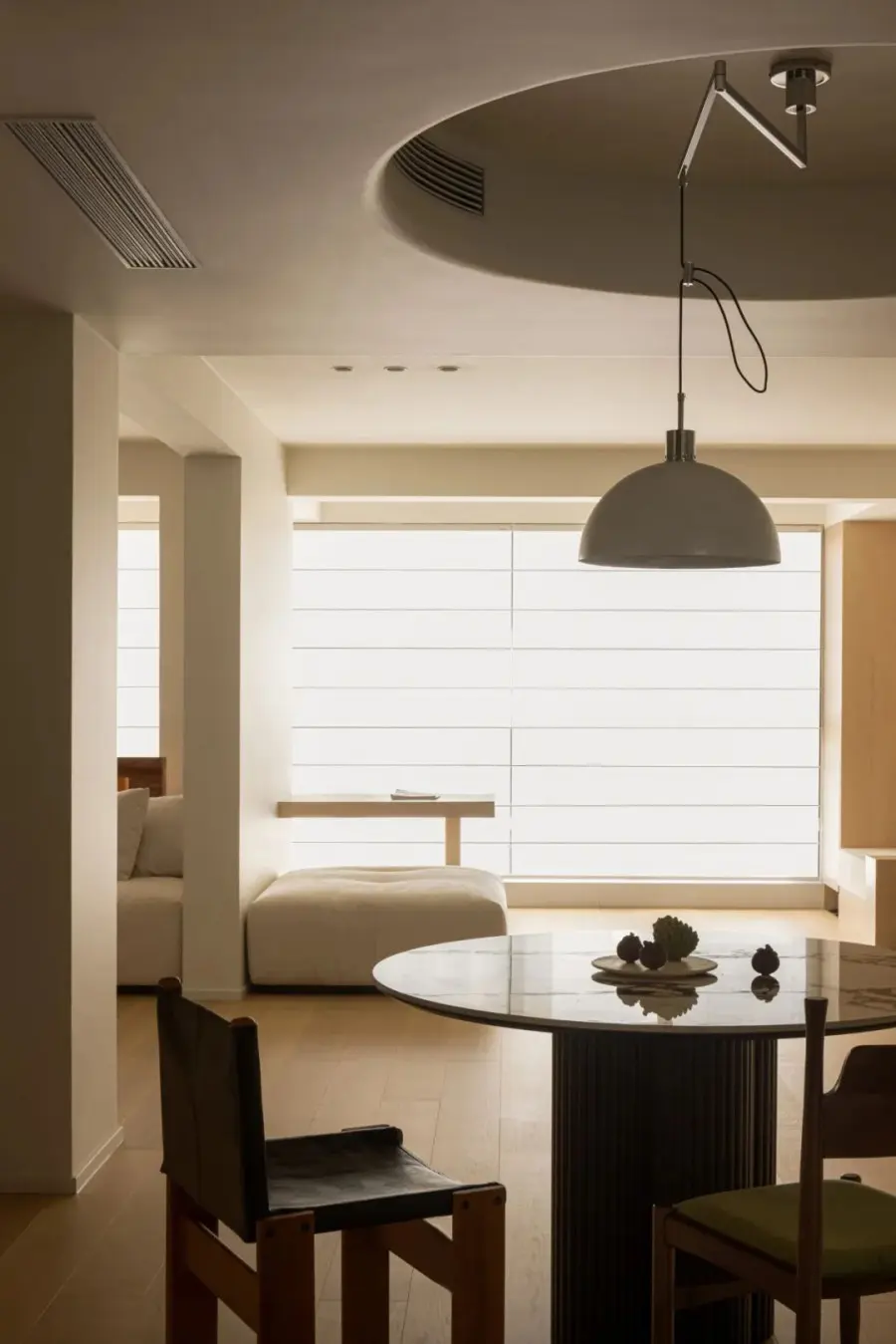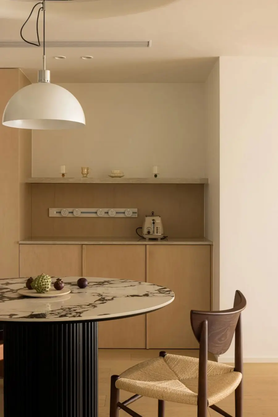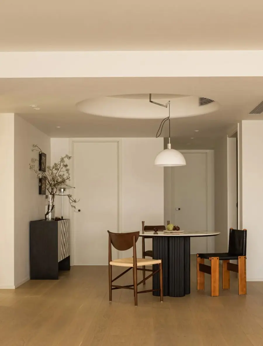 餐厅以女主人喜爱的中古×包豪斯为基调,方圆之间自有天地。位于多条动线的必经之处,为维护其空间的怡然自处,以圆为视觉落点聚焦,几把餐椅以围合之势布局,圆弧吊顶上下呼应,不同元素与形式的交融碰撞,有所言说却又静默无声的艺术化空间自此展开。
