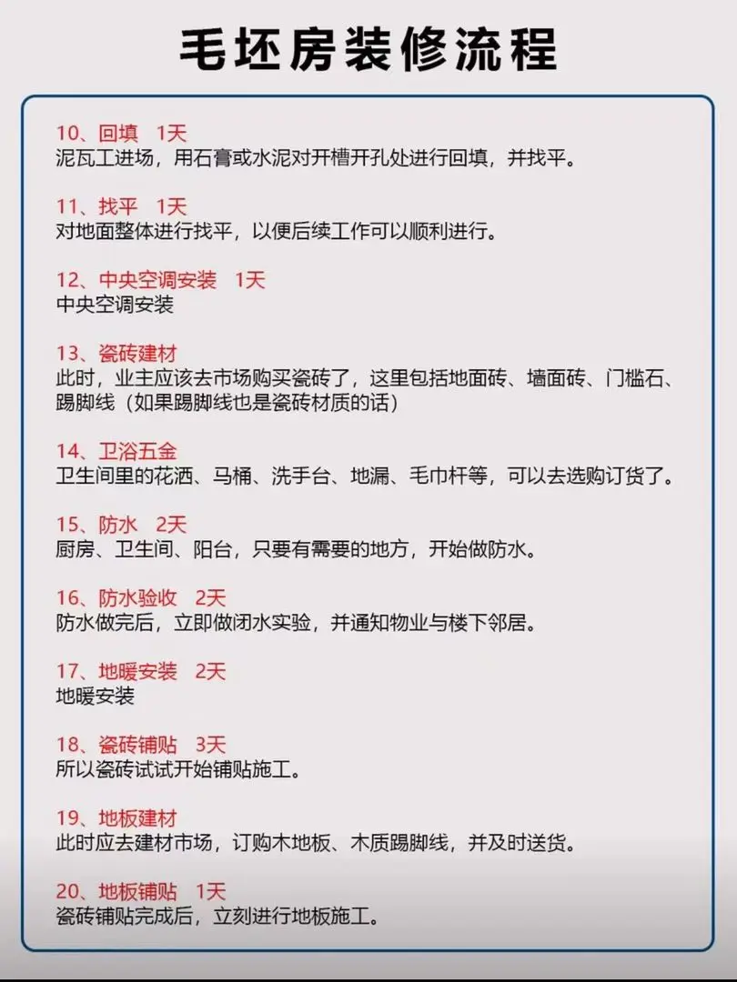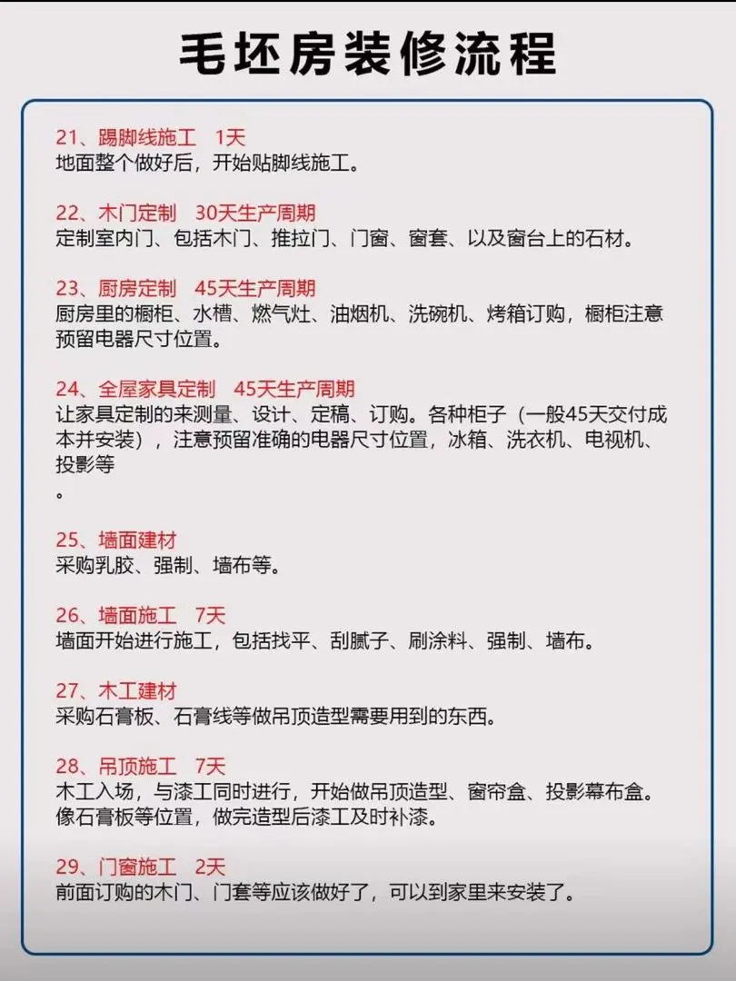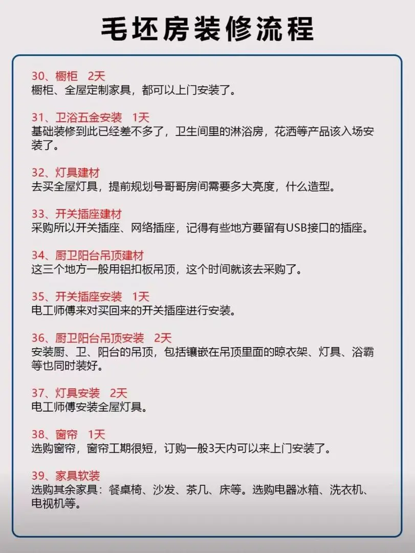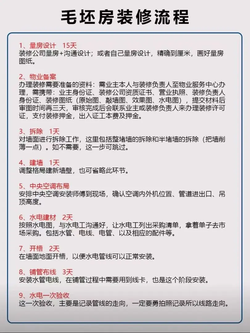 整理了家里装修从头到结束的过程,以及需要花费的时间,超详细的毛坏房装修步骤,大家可以参考着,有什么需要的直接私信我。