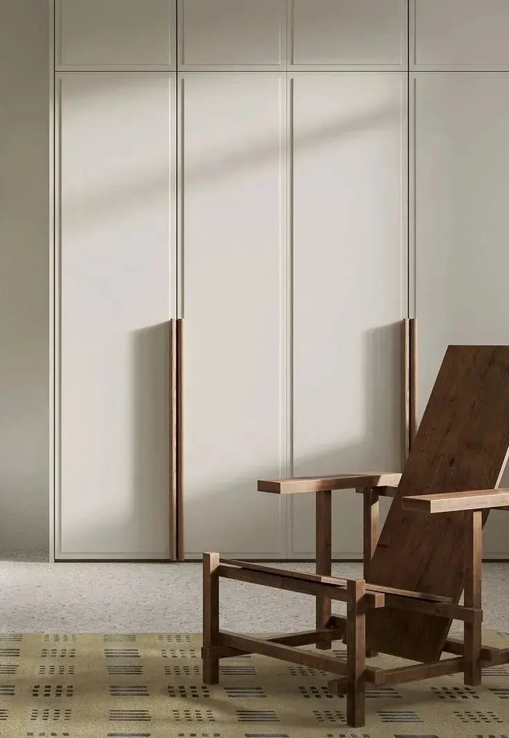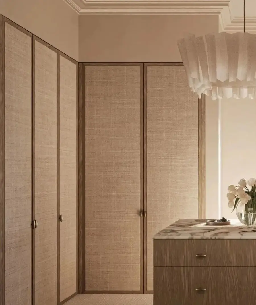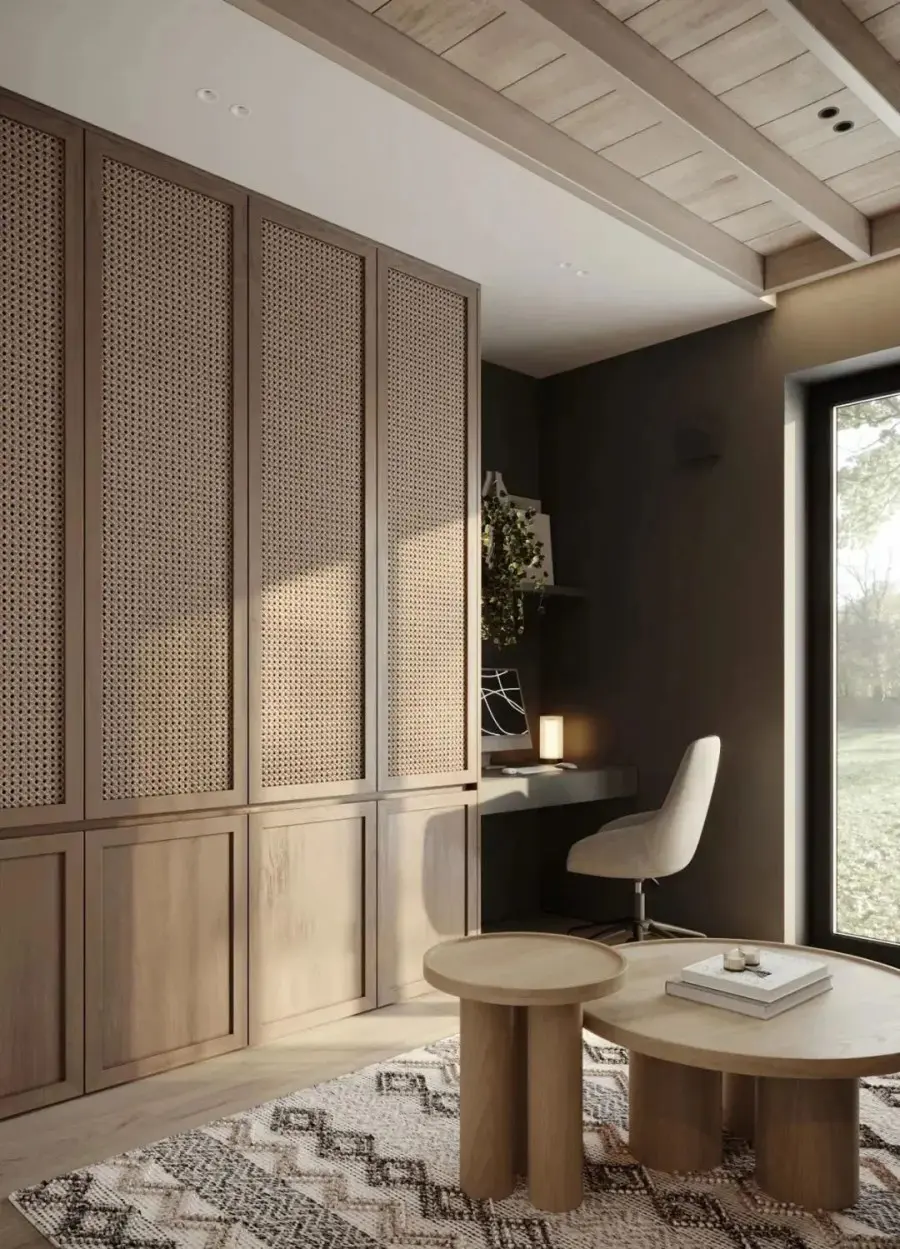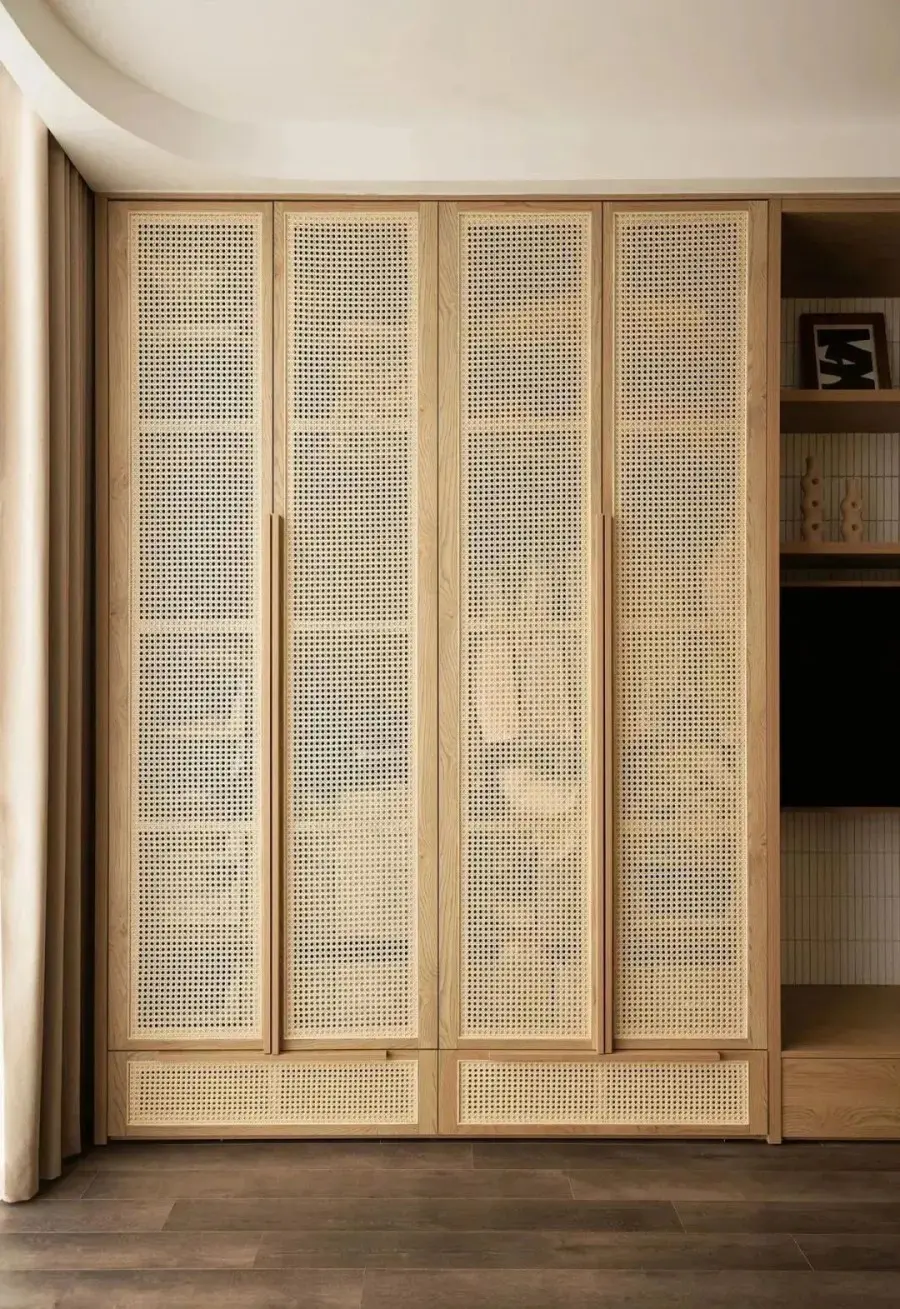 藤编元素运用到衣柜上,时髦又符合,在视觉上不仅能让整个空间变得更加轻盈,营造轻松舒适的氛围。在功能上能够保持衣柜内的物品透气通风,不易潮湿之外,还可以防尘,可谓一举两得。