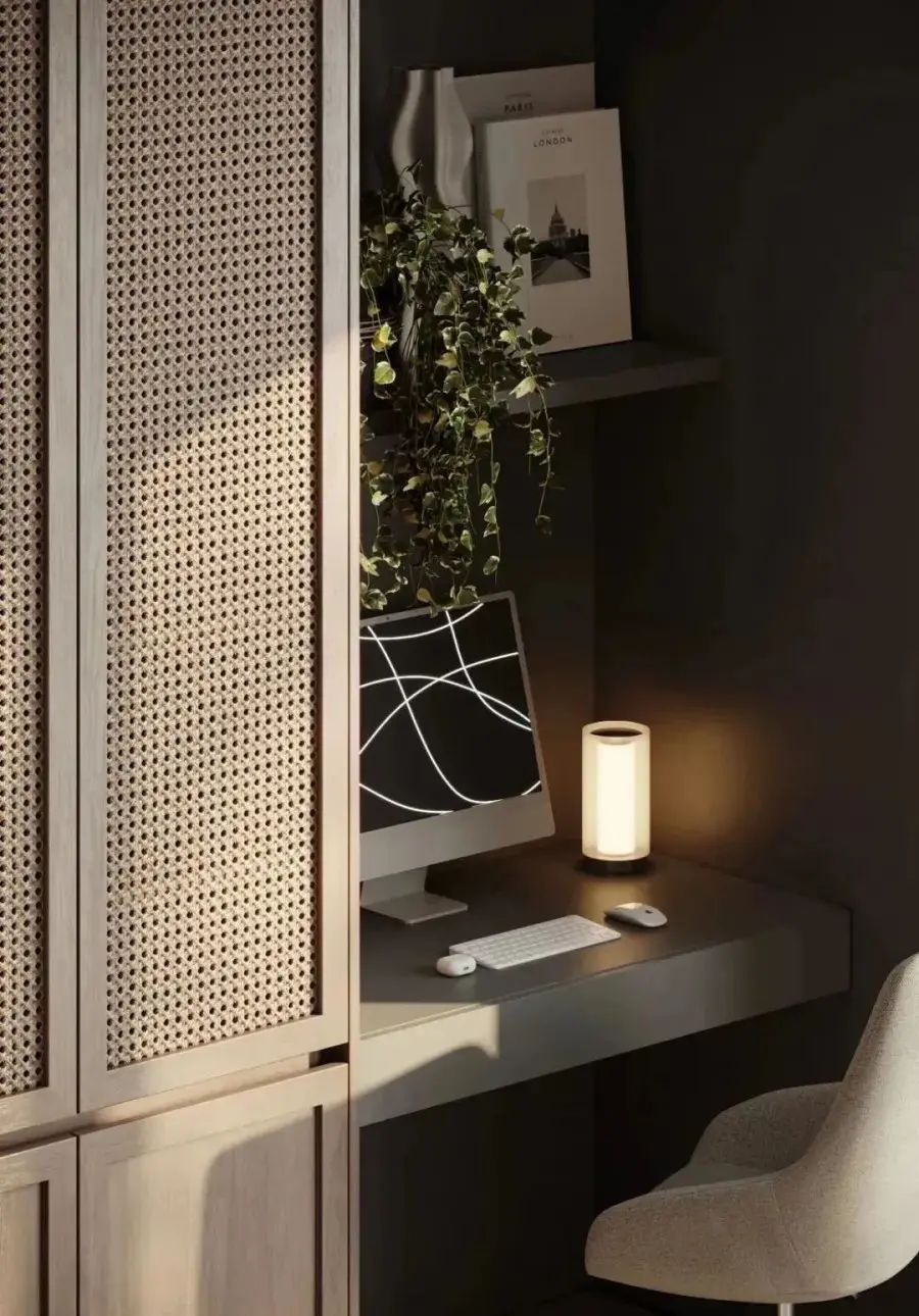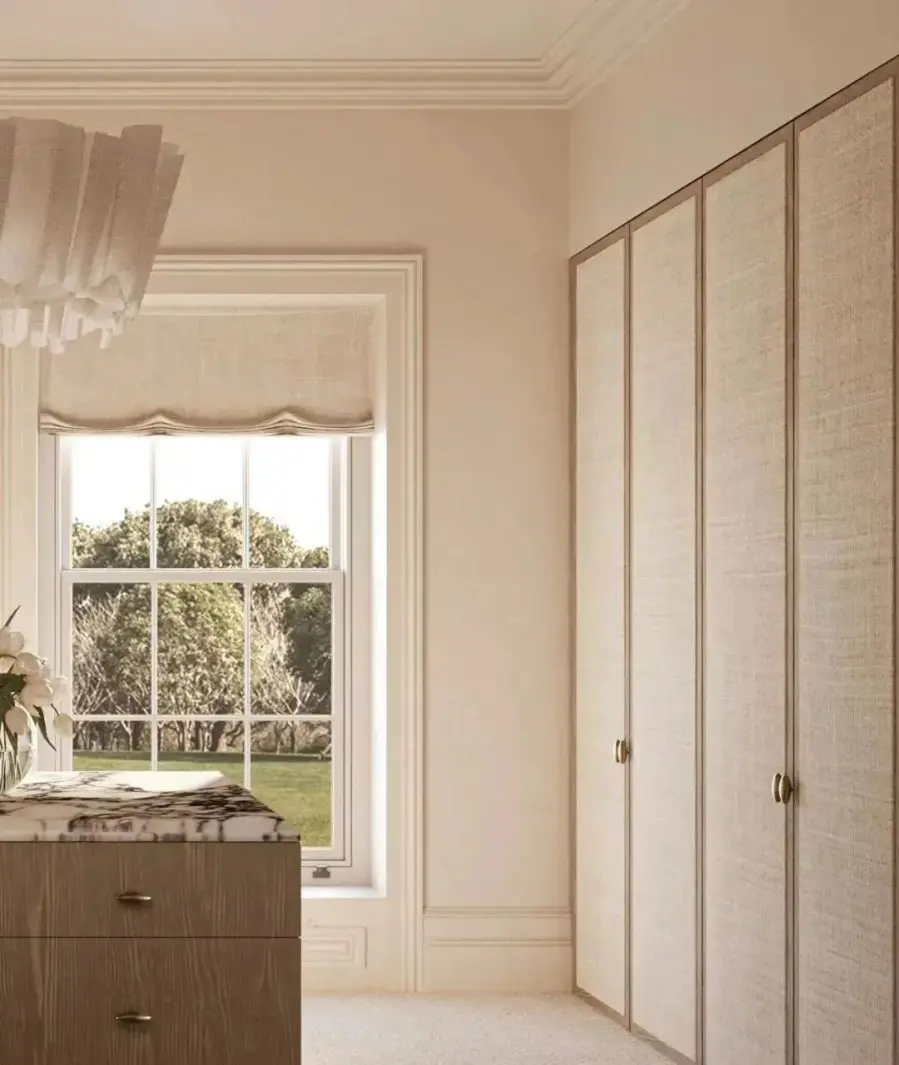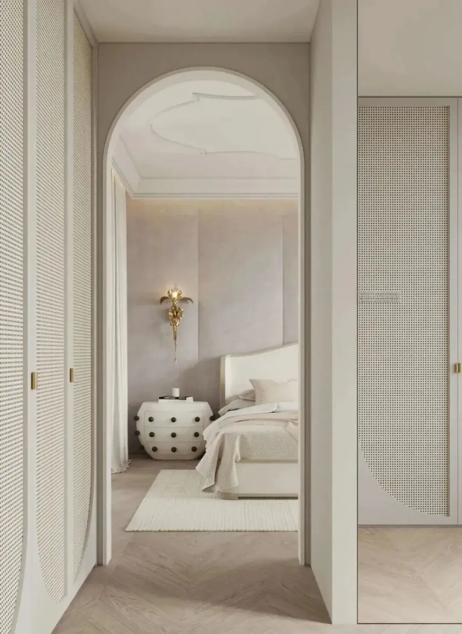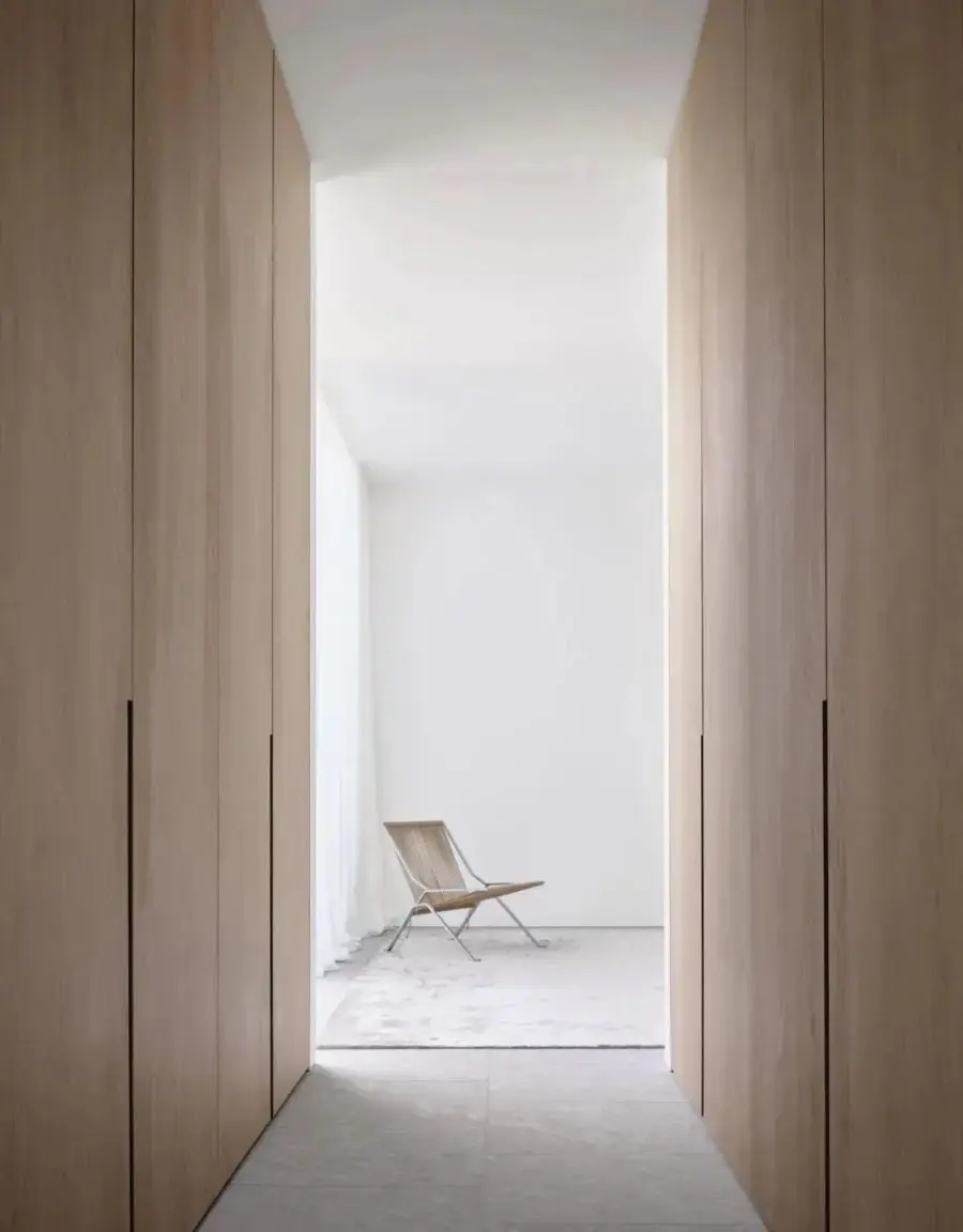藤编元素运用到衣柜上,时髦又符合,在视觉上不仅能让整个空间变得更加轻盈,营造轻松舒适的氛围。在功能上能够保持衣柜内的物品透气通风,不易潮湿之外,还可以防尘,可谓一举两得。