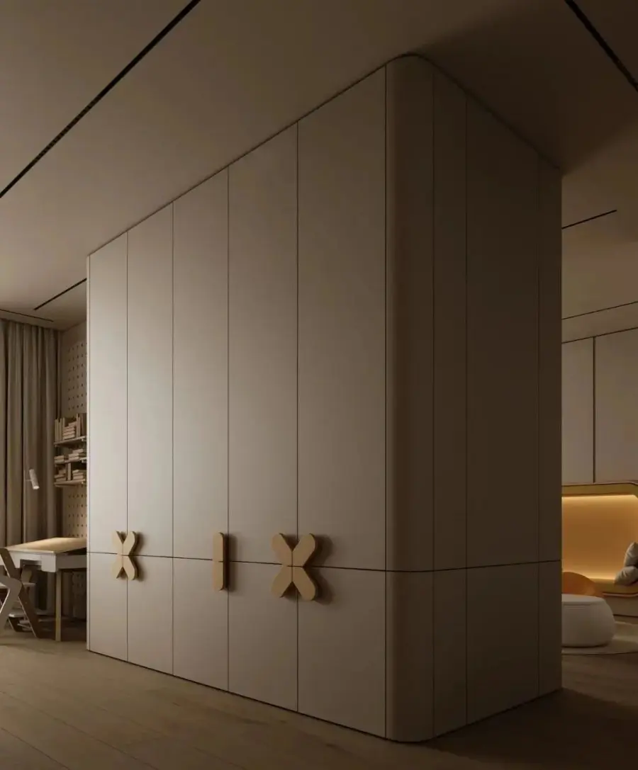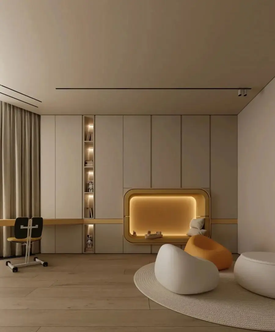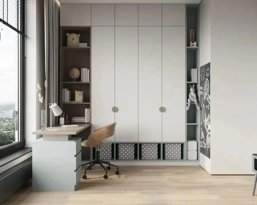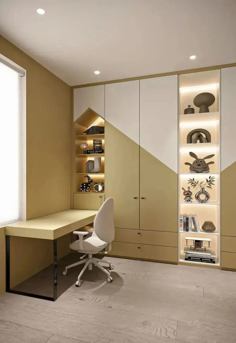 儿童房的定制衣柜,不仅需要采用明度高的色彩、活泼大胆的配色,还要让孩子可以轻松收纳玩具、衣物、书籍等各种杂物,尽量利用好每一个小角落和转角的空间,满足收纳、展示及学习等多重需求。