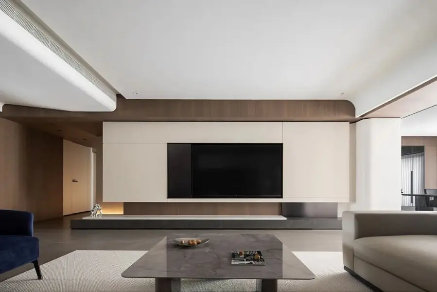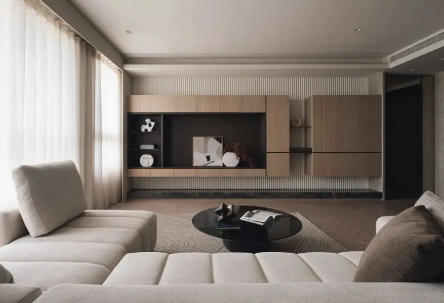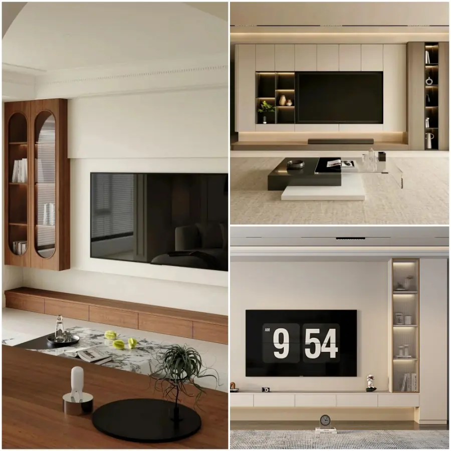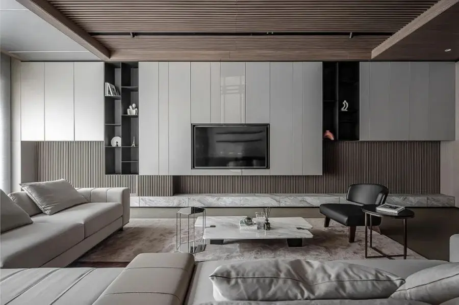 组合式电视柜是对传统一字柜的一个创新延伸,它通过结合一字柜与各类其他家具,储物柜及吊柜组合,提供了多样的设计选项,形成一体化的多功能区域。这类电视柜主要呈现为L型或C型,不仅扩充了客厅的储藏空间,还在视觉上保持了电视墙的留白和简洁,增强了空间的通透感。它特别适合中等大小的居住空间。