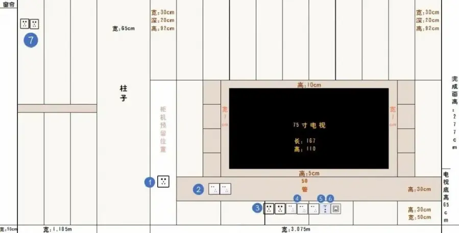 预留电源和设备储放地,以便摆放机顶盒、音响和路由器等影音设备。为了确保足够的电源供应和安全,开放区域的墙面应装设至少3至5个电源插座。同时,为了便于电缆的管理和弯曲,插座应从台面下方至少预留5厘米的空间。