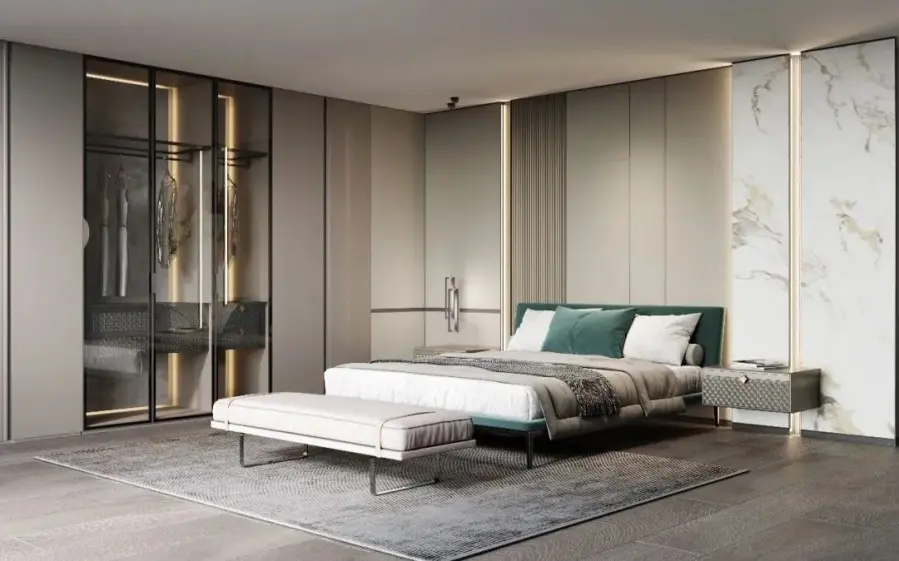 装饰细节:墙面采用金属线条装饰,增加奢华感。