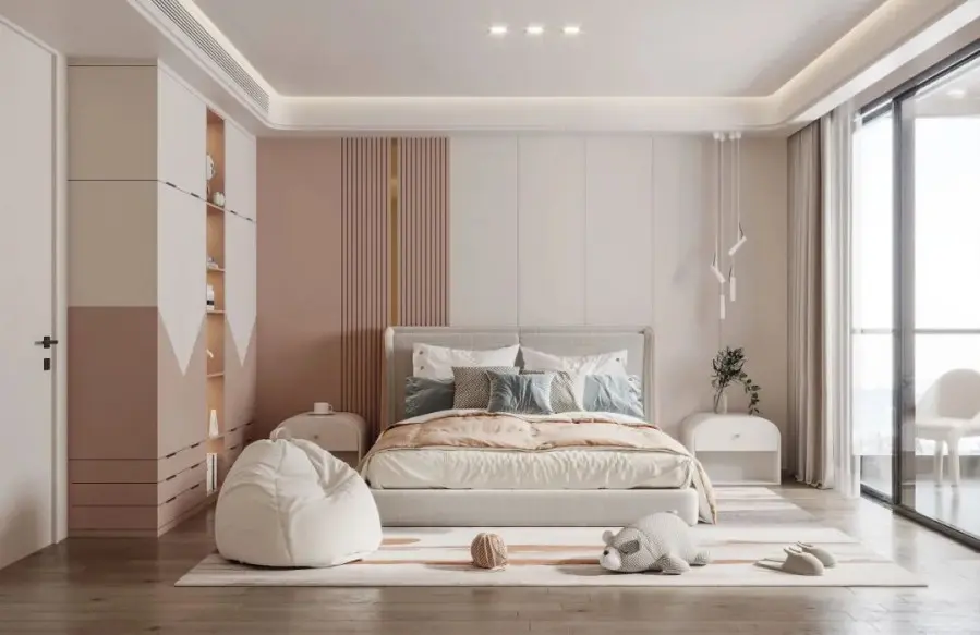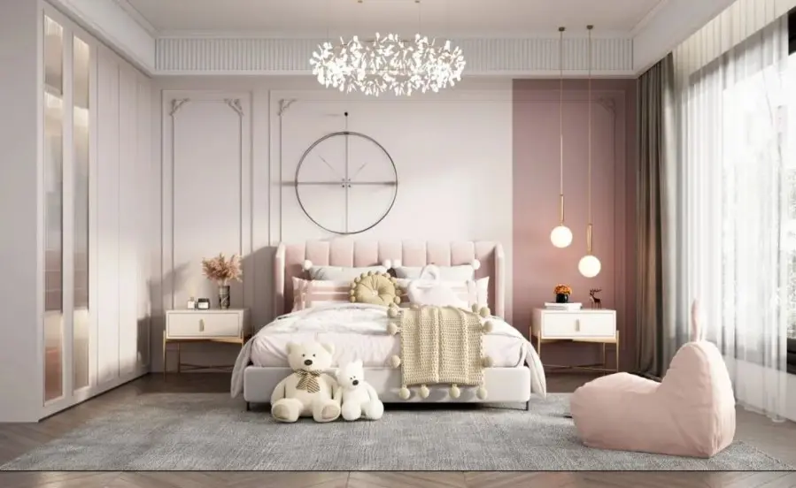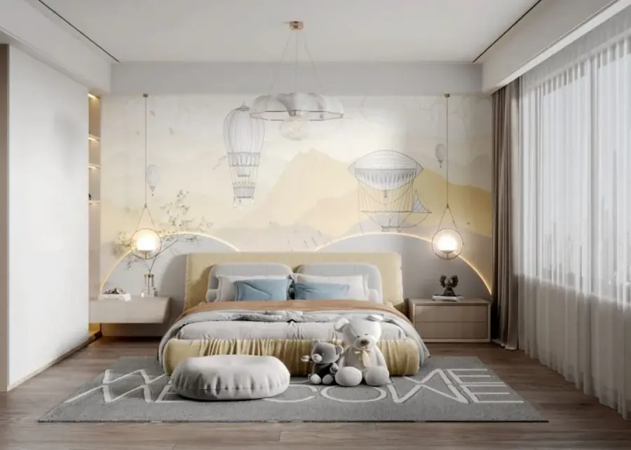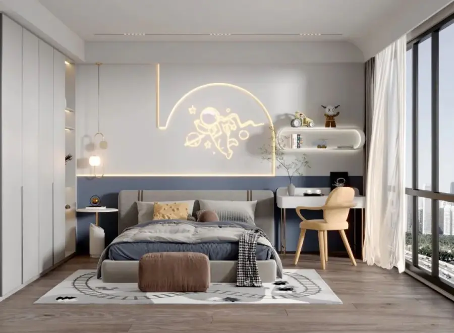 建议:在儿童房安装一个可调节亮度的灯具,在夜晚将亮度调低,有助于消除孩童独自睡觉时的恐惧感。儿童房的灯具适合采用暖光源,灯具要远离孩子能摸到的地方,电源插座也要安在隐蔽位置。
