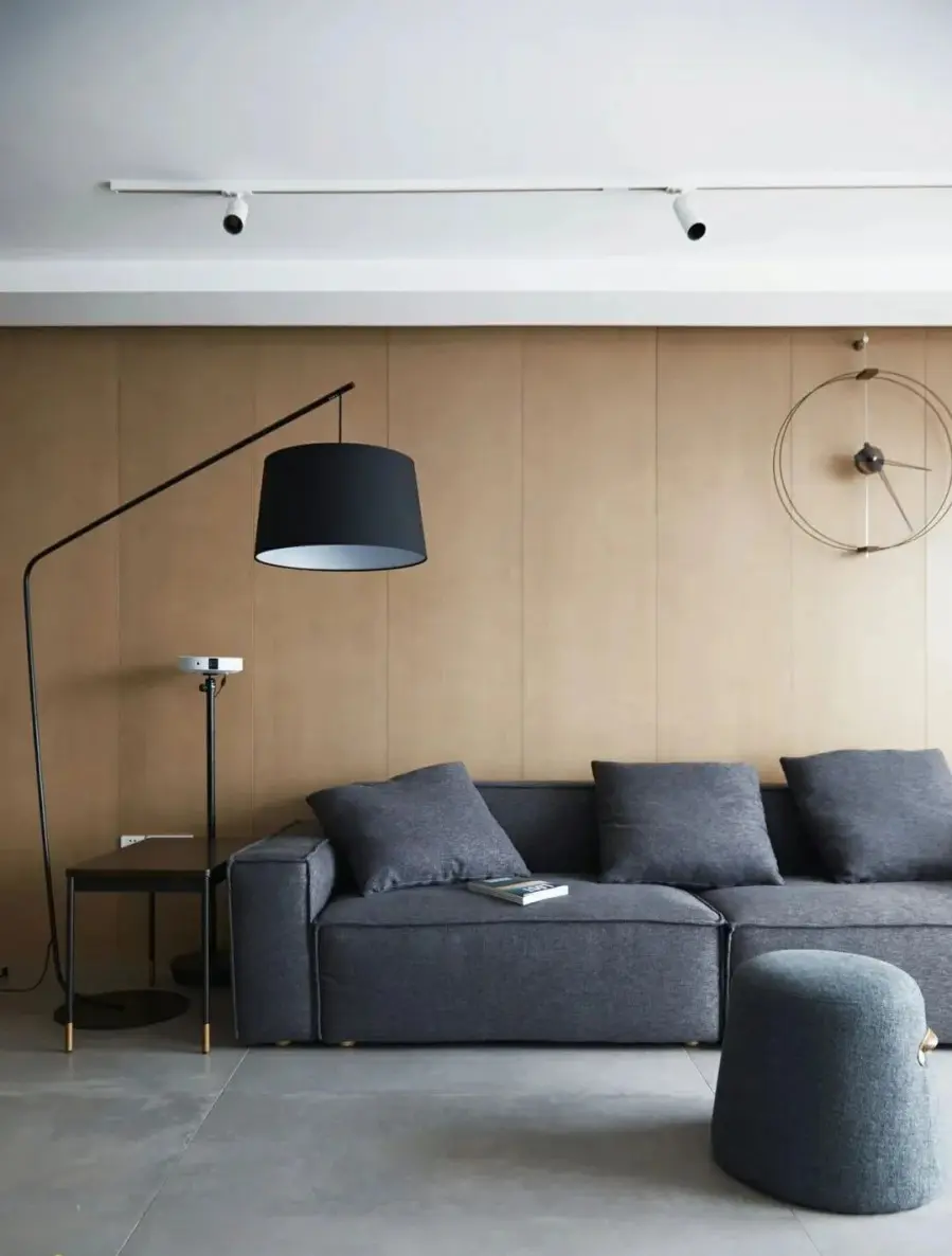 ▲客厅,木饰板沙发墙,搭配深灰色布艺沙发,简洁大方。没有多余的装饰,采用无主灯设计,放弃了传统的茶几,看起来大了不止两倍。