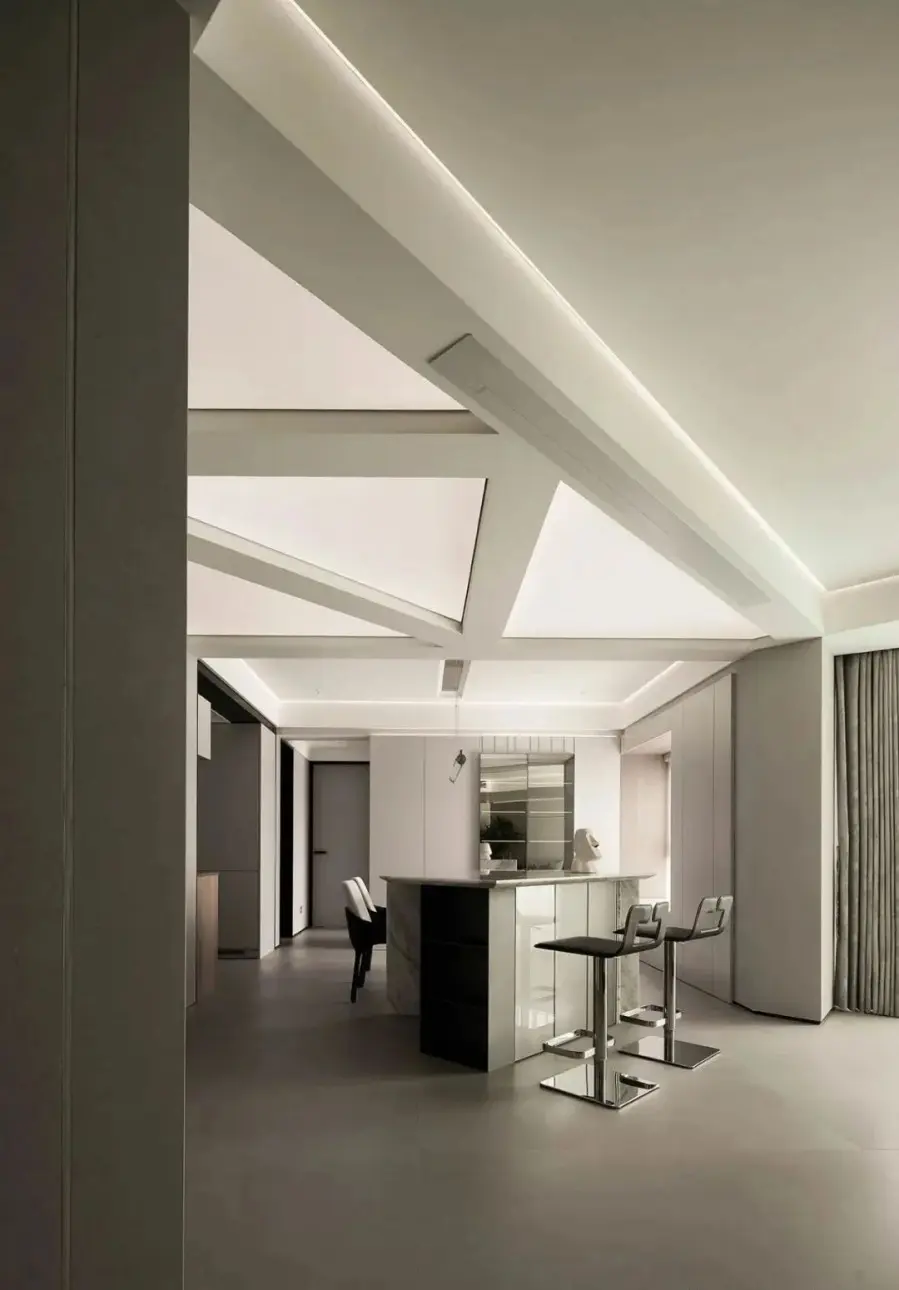 ▲ 拆除原本的电视墙,让整个客餐厅空间被打开,考虑到业主有投影的需求,因此设计师将原本的横梁“合二为一”,将幕布设计在横梁上,这样丝毫不影响空间的开阔,也能实现家庭电影自由