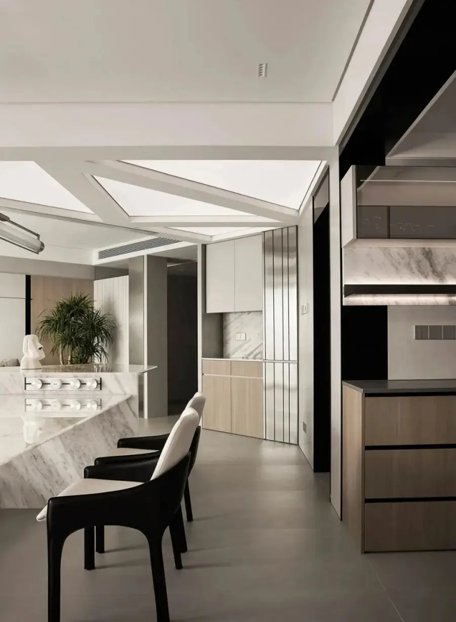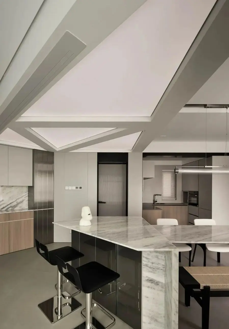 ▲ 定制异形岛台,黑与灰的自在表达下是储物满满的实用性