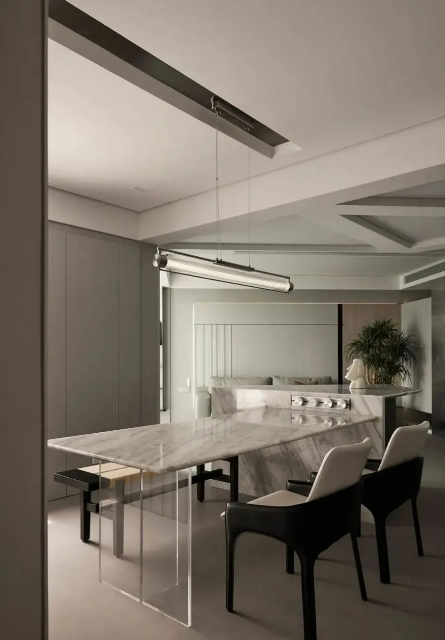 ▲ 业主会时常有聚餐的需求,因此在餐桌的尺度上根据空间的比例也进行了适当的放大,亚克力桌腿显得轻盈高级