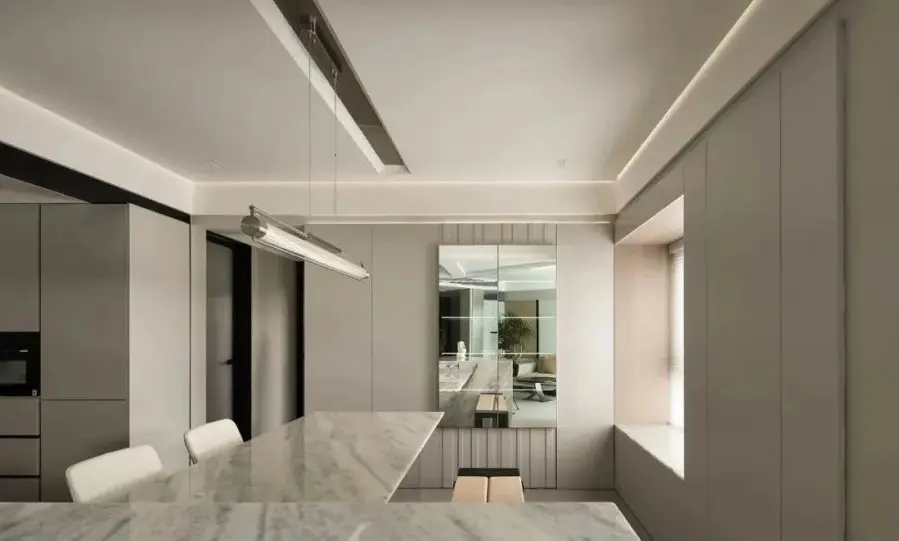 ▲ 餐厅墙面靠近窗户的地方设计了一面镜子将自然的风景和光线引入室内,同时这面镜子的背后是储物柜