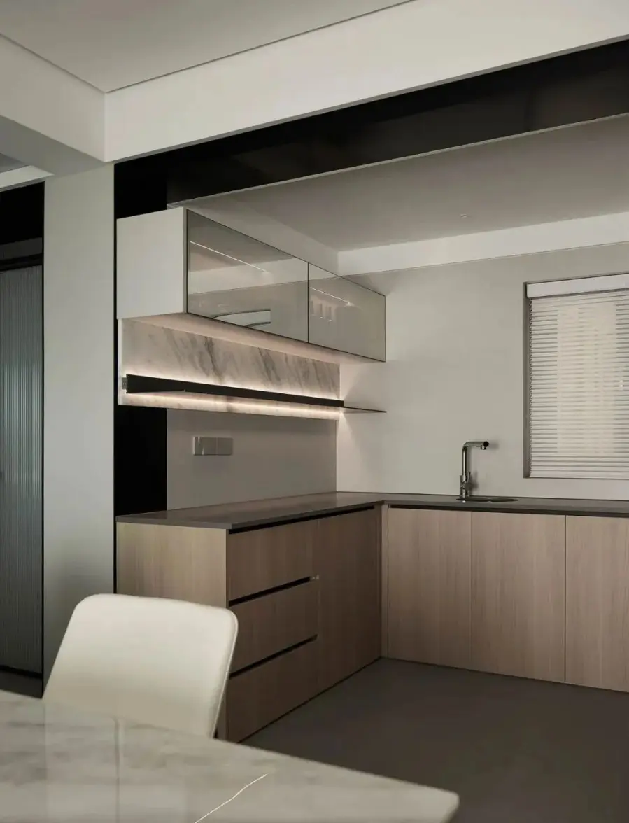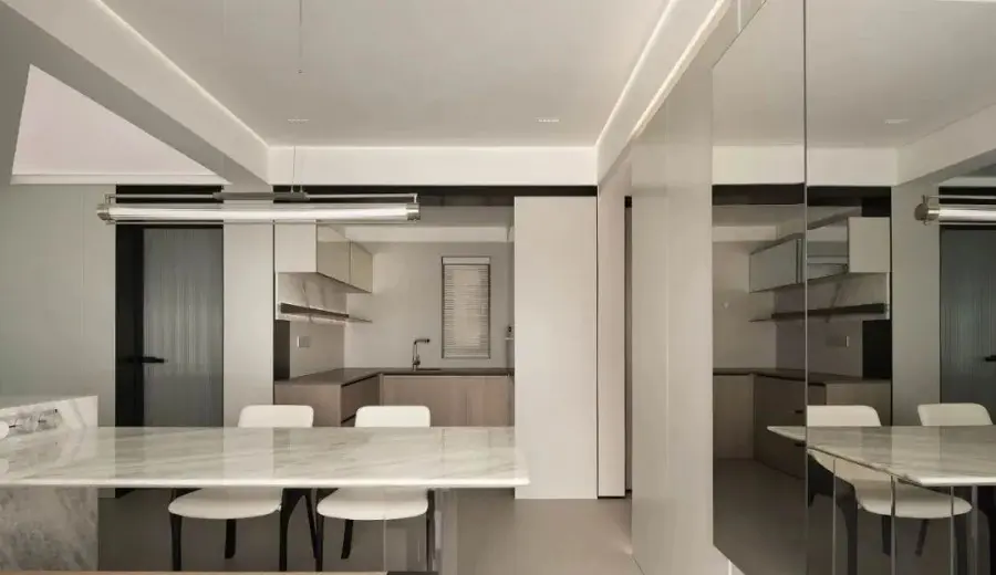 ▲ 餐厅看向西厨视角,左侧长虹玻璃门后是中厨
