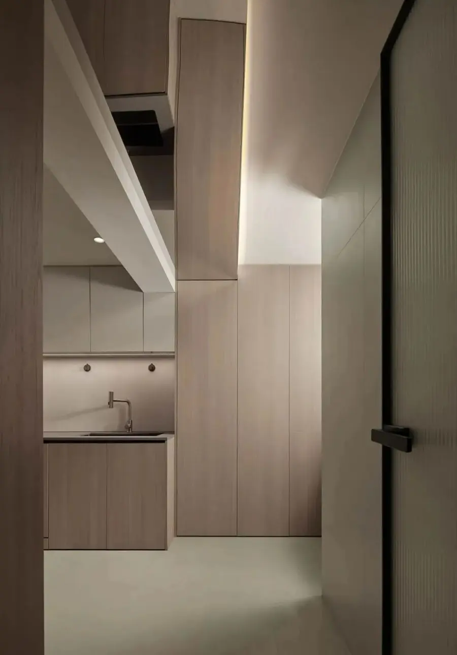 ▲ 左侧利用原餐厅区域设计成储物间(平面图可见),一些经常外出需要用到的物品便可以存放在此