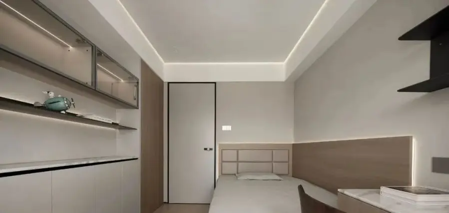 ▲ 储物功能满满的儿童房,半围合式的护墙板给予空间安全感,嵌入灯带营造氛围和层次