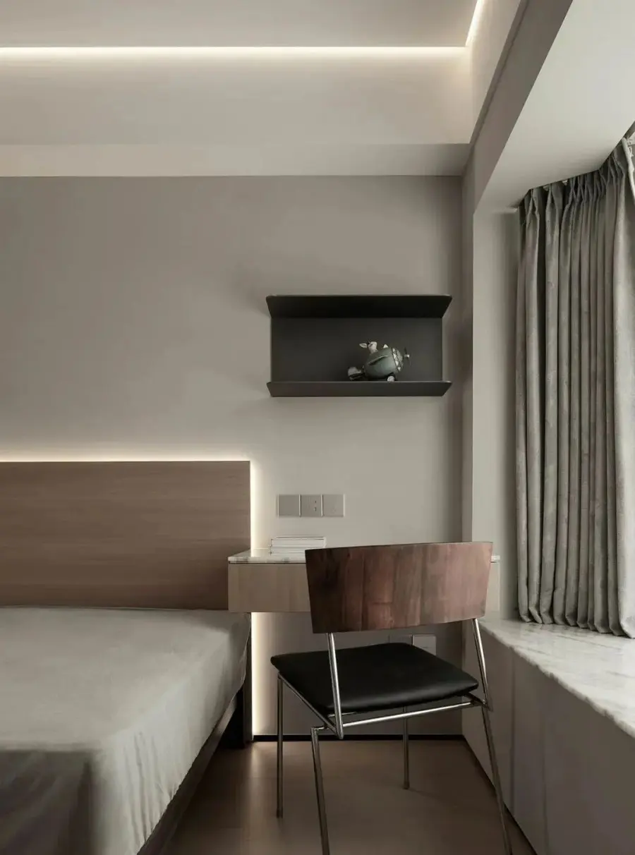 ▲ 沿窗定制悬浮书桌兼床头置物功能,纵横交错的线性灯充分满足照明需求