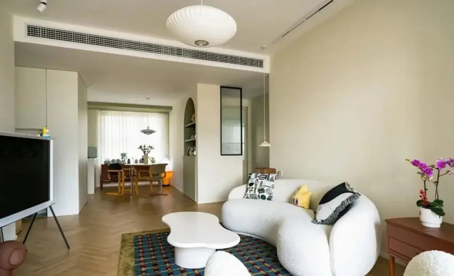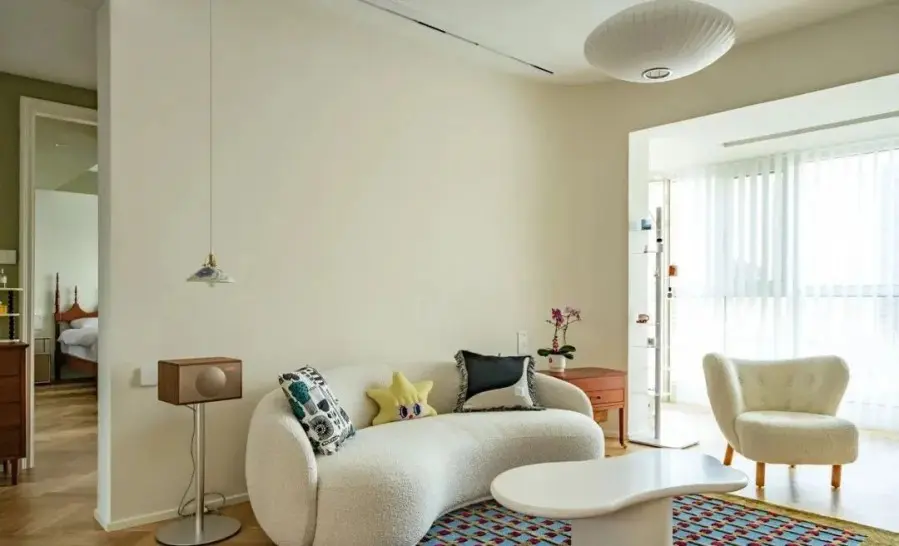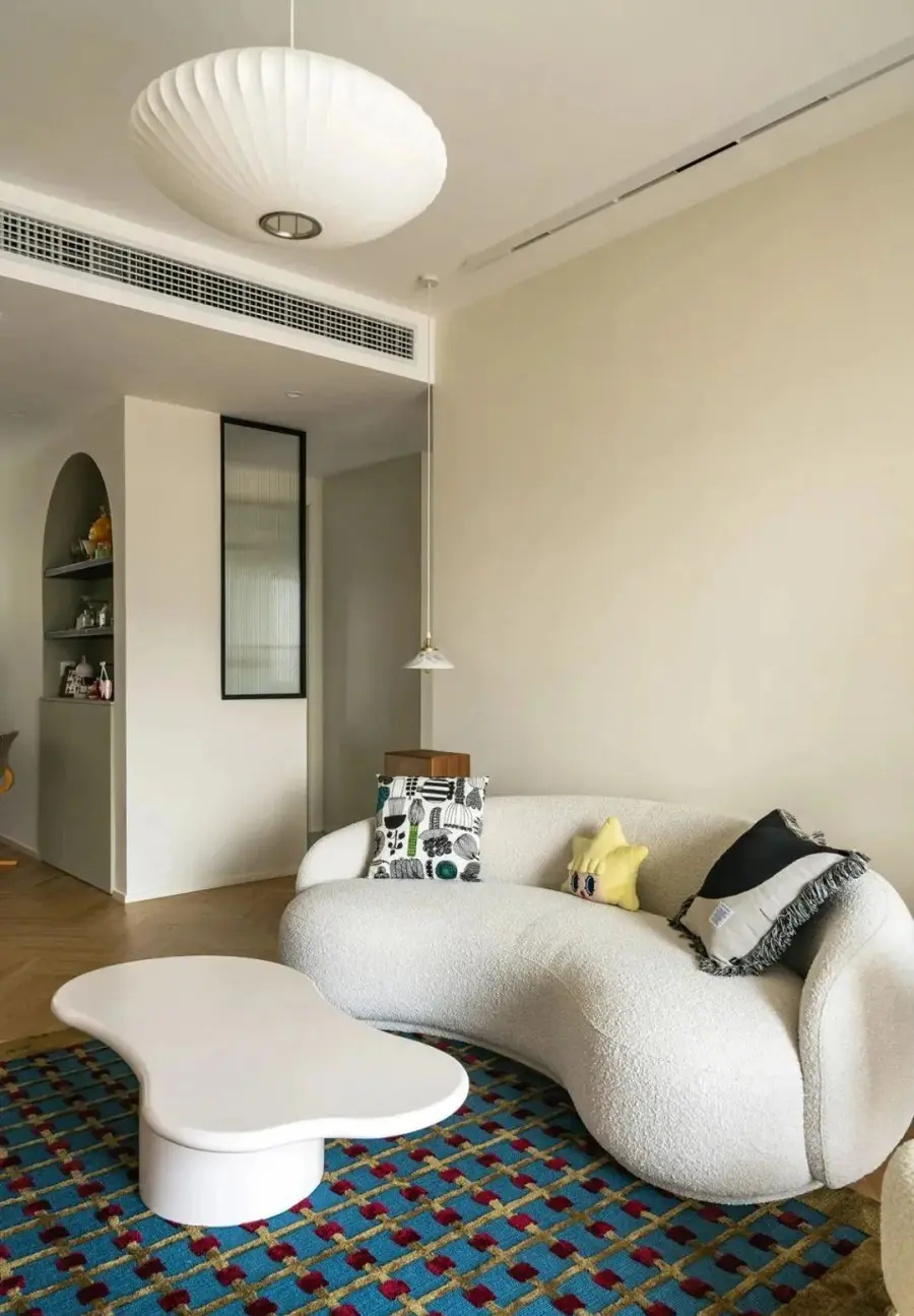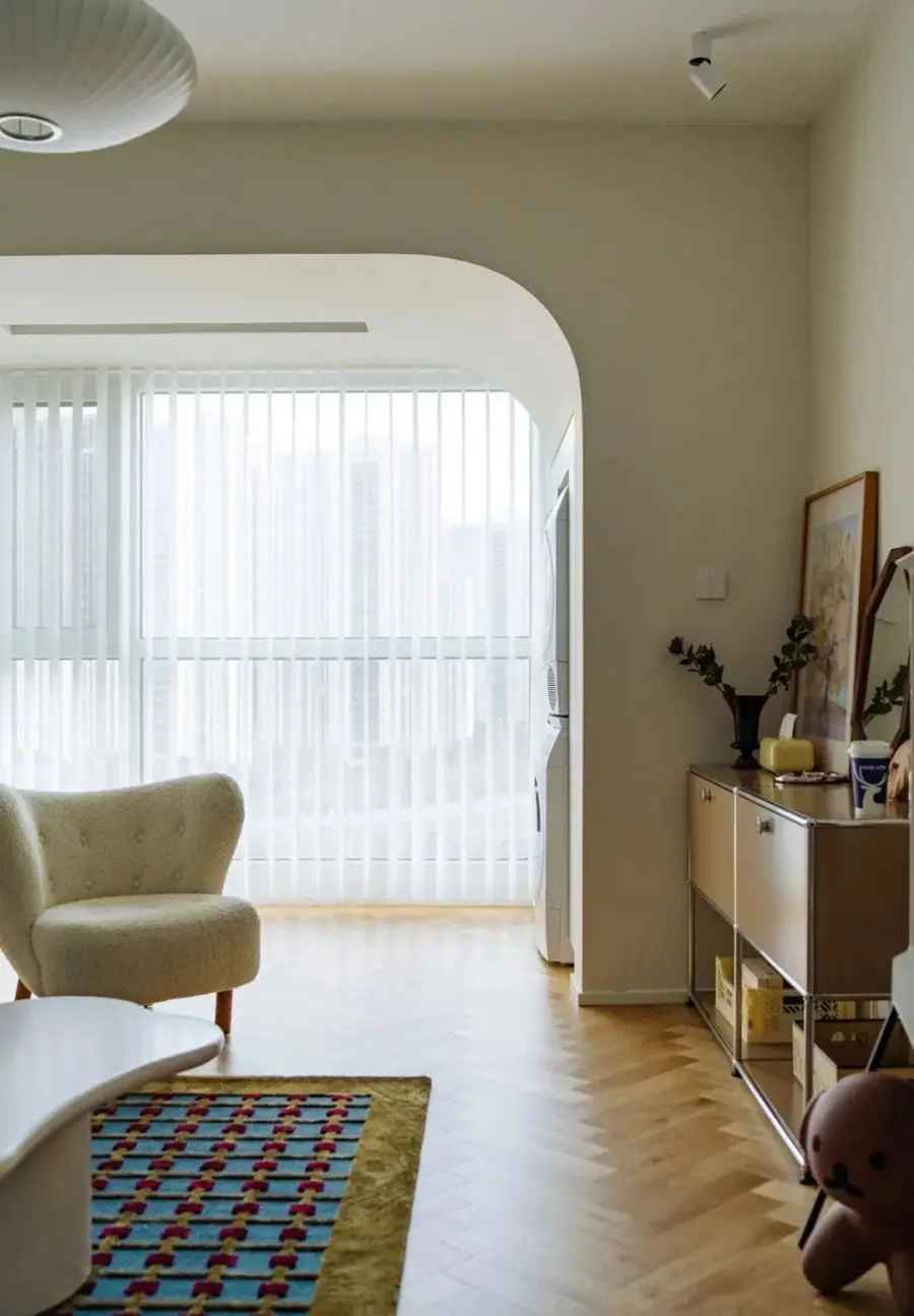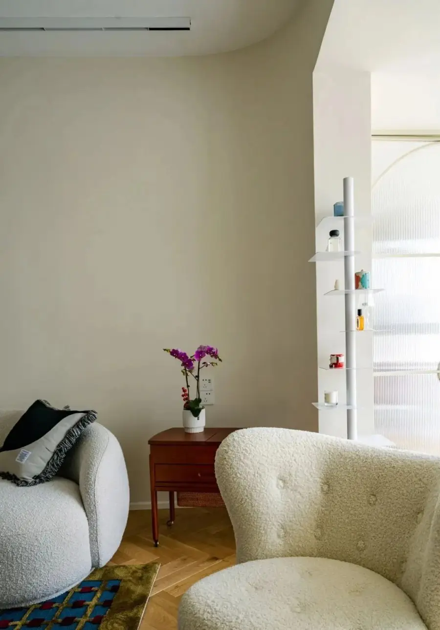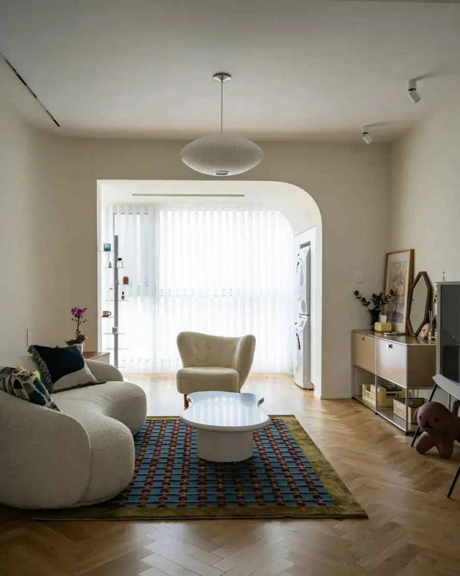 ▲ 客厅打通阳台,以半弧形垭口过渡,奶油色墙面奠定空间优雅格调