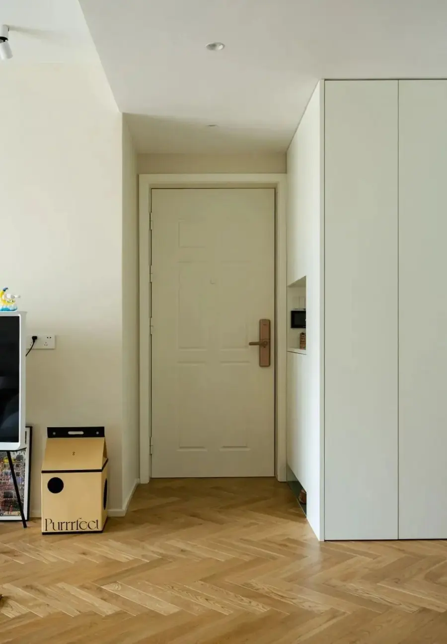 ▲ 拆除入户玄关墙体,把玄关柜和厨房柜子连为一个储物整体,让空间更加规整并且储物率提升