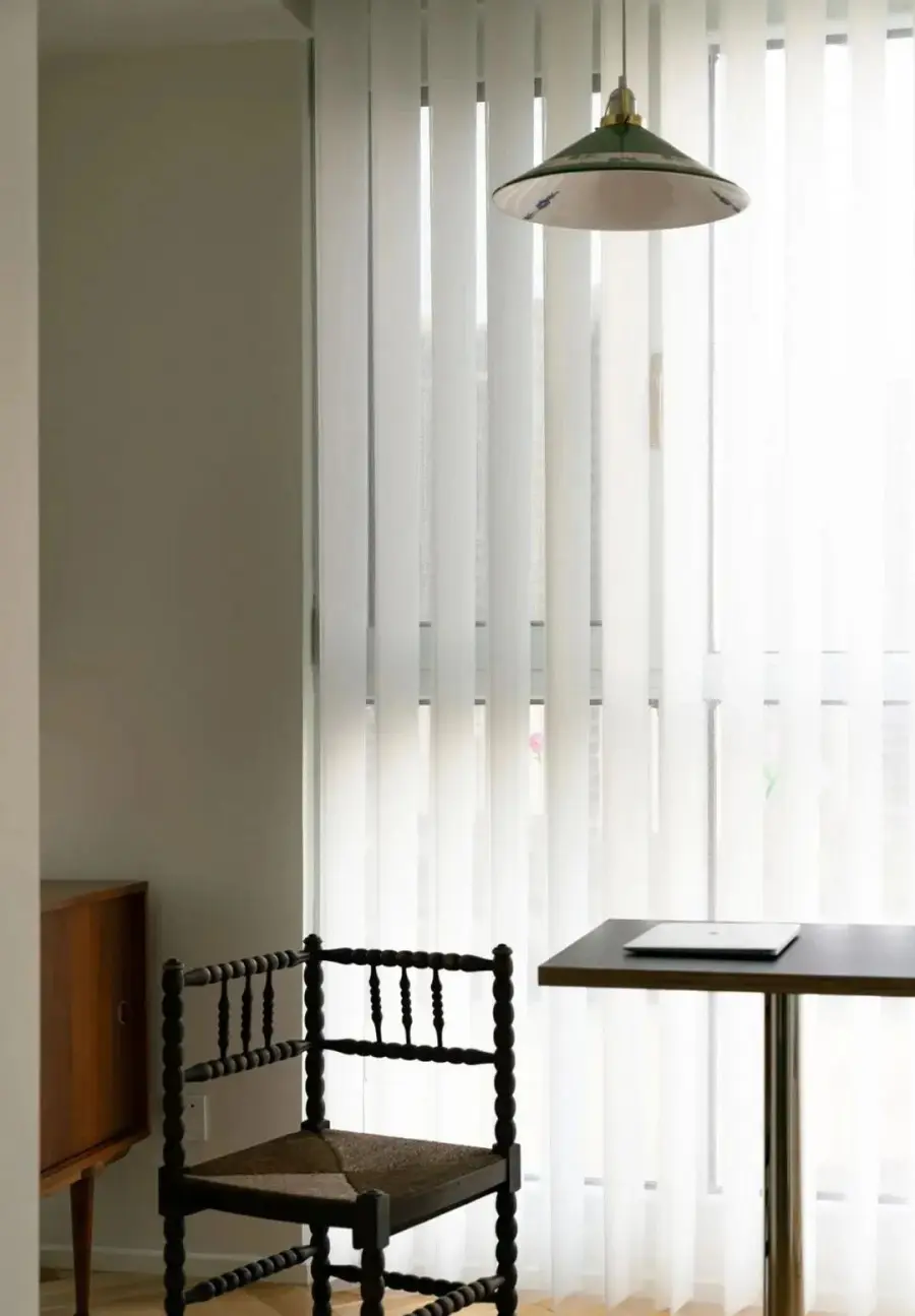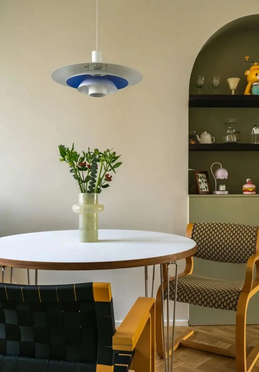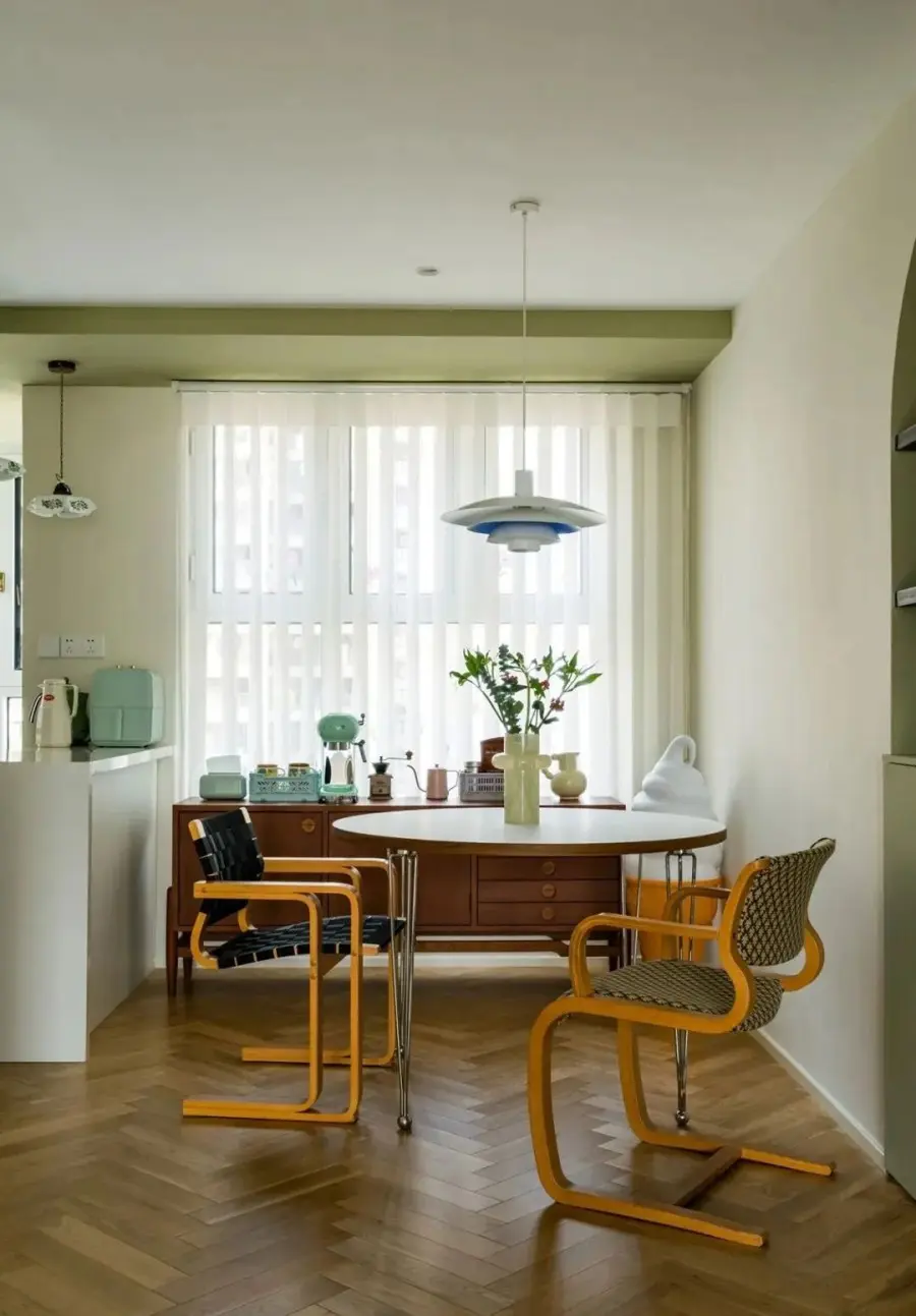 ▲ 餐厅,白色桌面与不锈钢桌腿结合,再配上中古餐椅,腔调感十足,拆除原飘窗,又好看又能装