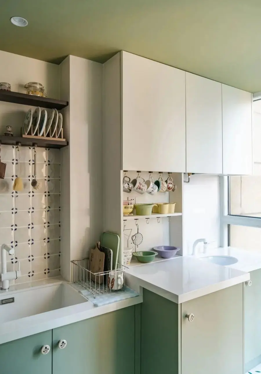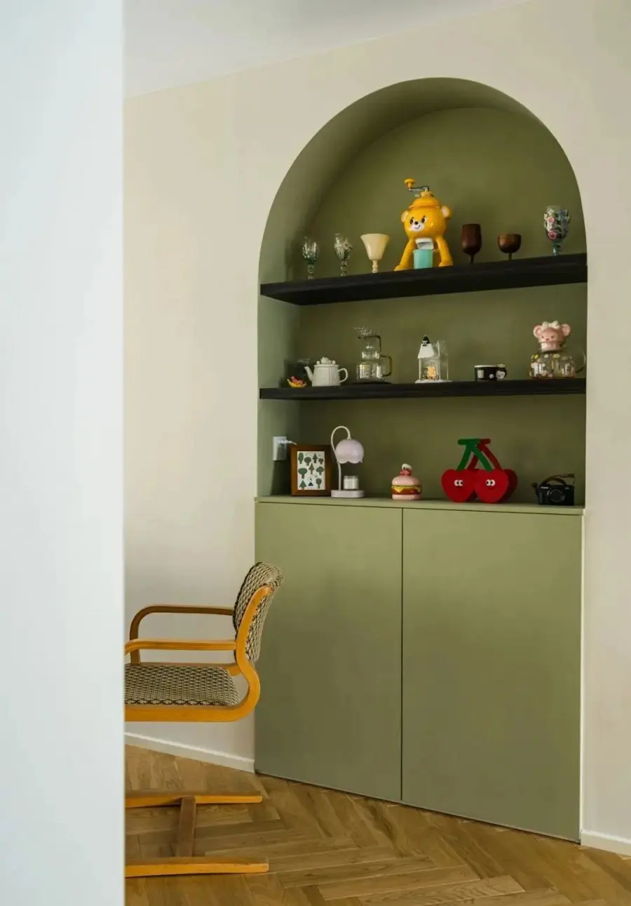 ▲ 用部分公卫空间,为餐厅新增一个嵌入式收纳柜,灰绿调的墙漆为平淡生活增添一抹盎然生机。