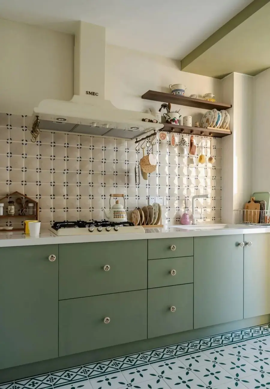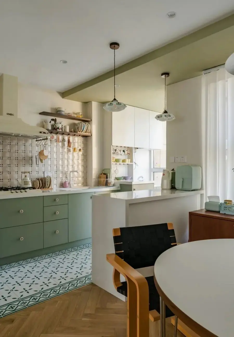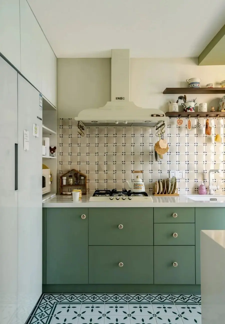 ▲ 绿调的地砖配合绿调的橱柜本身已经很自然田园,再加上墙面的半墙手工砖,这种随性的感觉马上溢出来,冰箱利用左边的玄关柜进行了内嵌