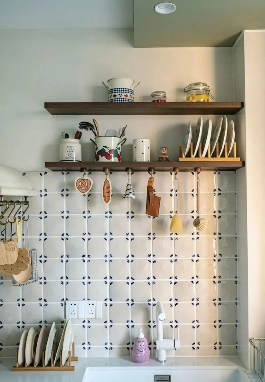 ▲ 厨房没有做吊柜,设计置物的隔板则用于常用物品的展示