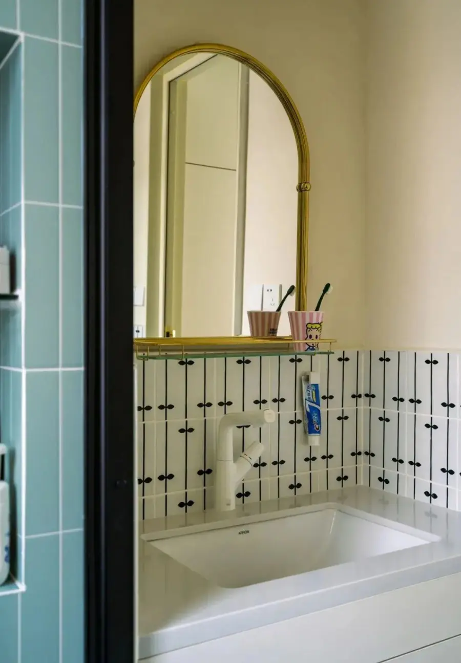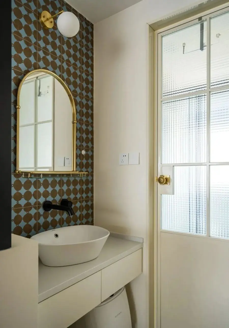▲ 公卫干湿分离,墙面铺贴复古砖,扫地机器人放置于洗手台下方,方便上下水