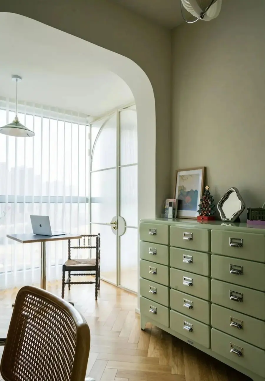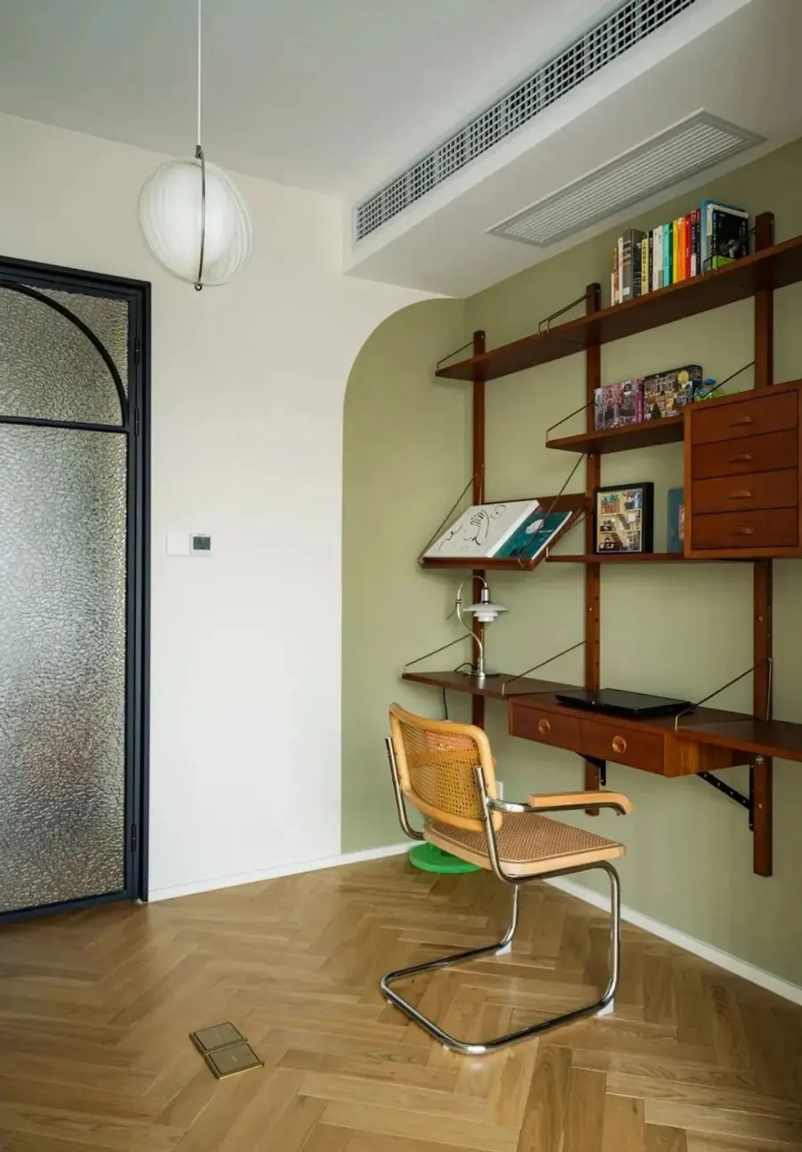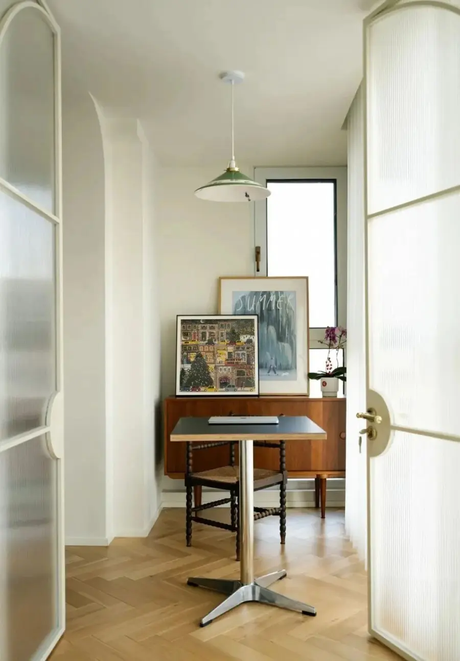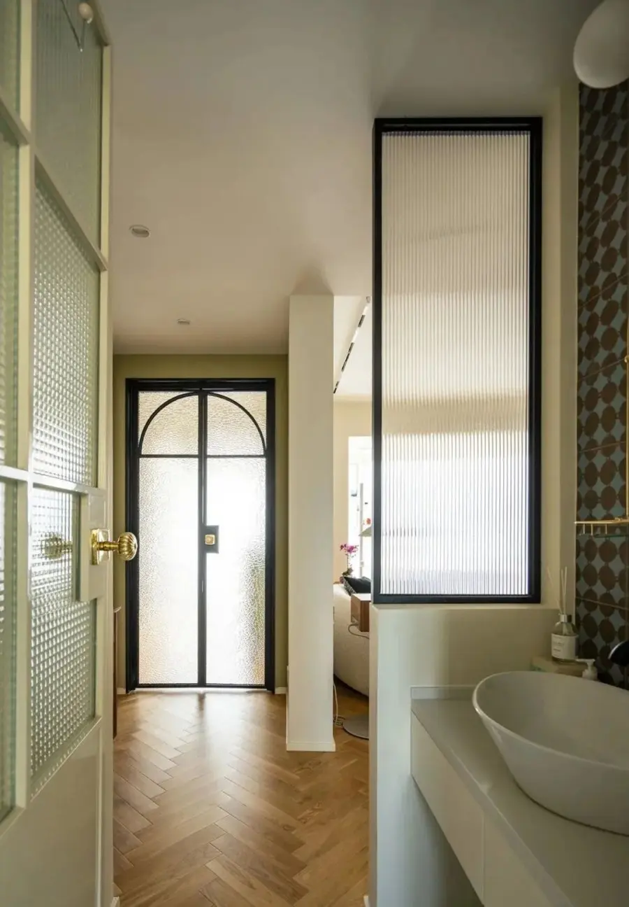 ▲ 从干区看向书房方向,通透的复古玻璃门优化过道的光线