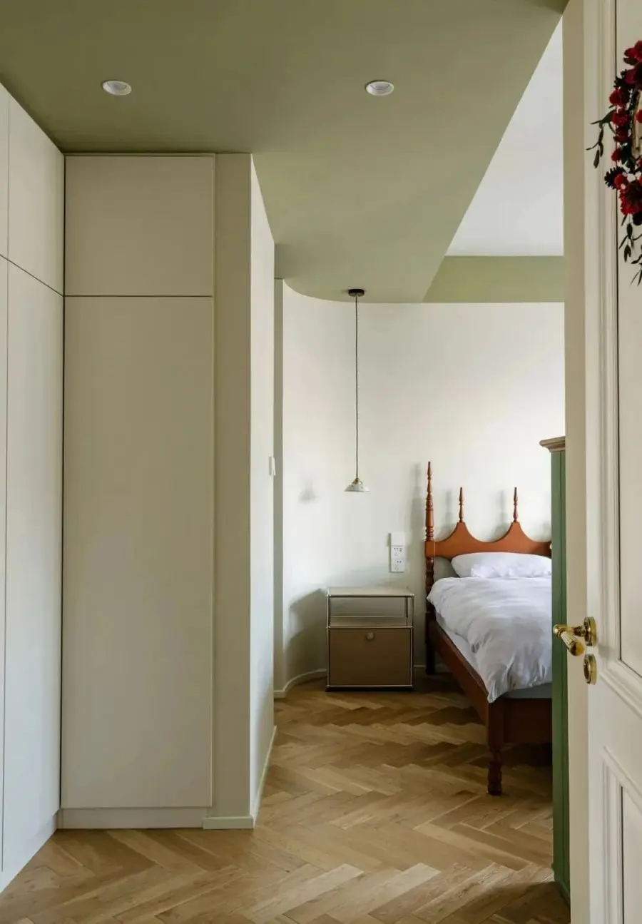 ▲ 进入主卧正对弧形墙,这个造型首先是以视觉导向性为主,其次才是发挥柔化空间的功能