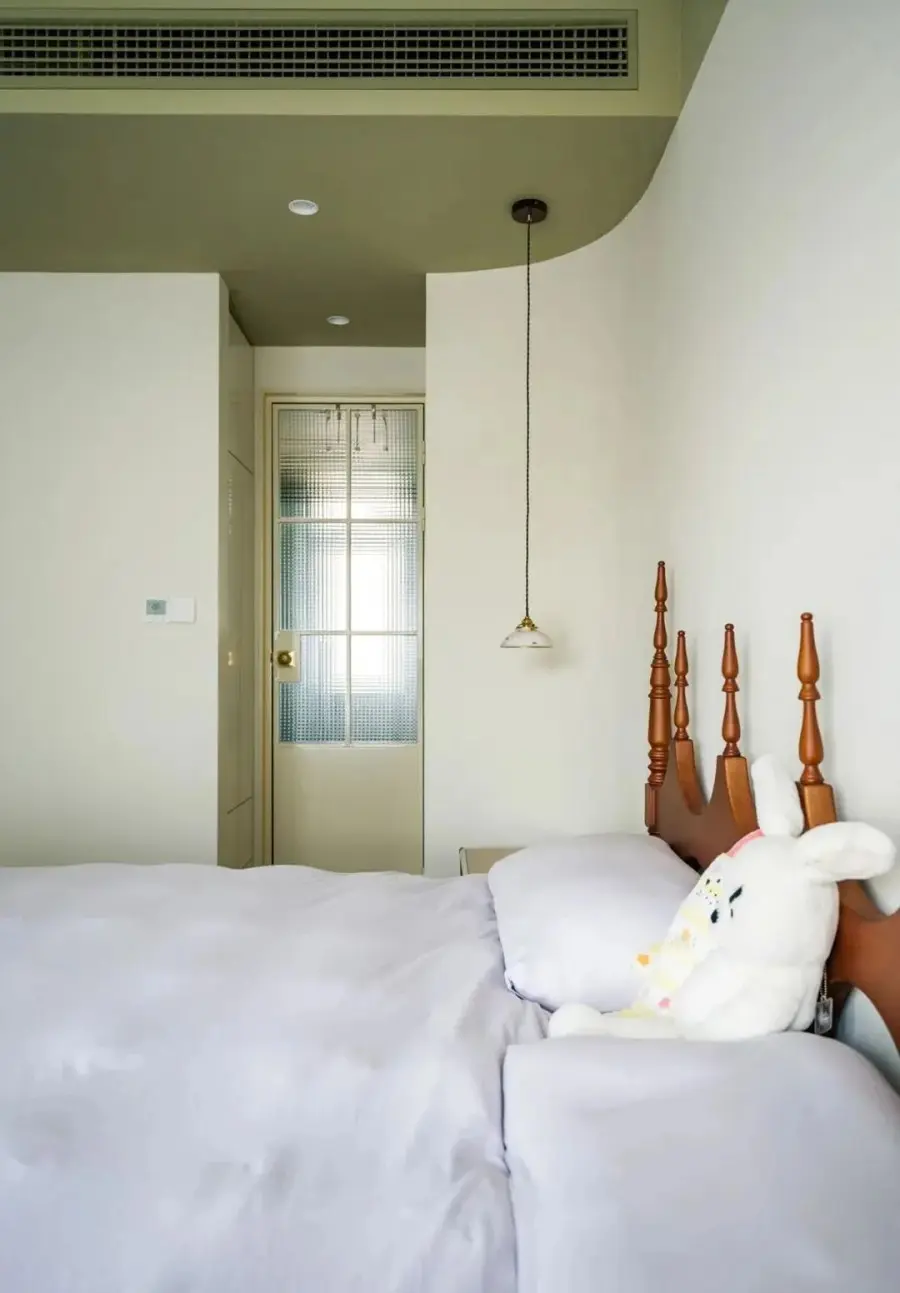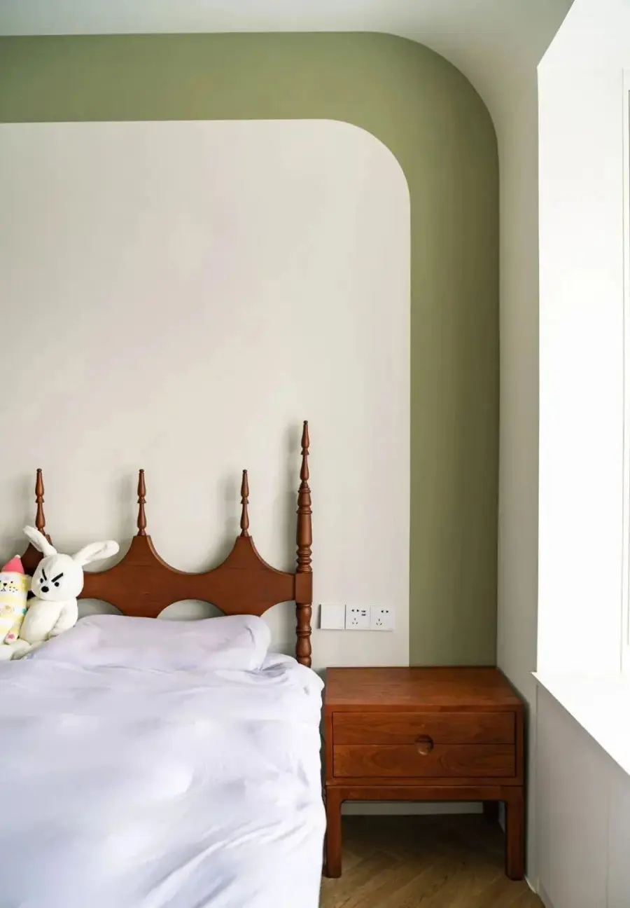 ▲ 床背景的形式根据空间的结构进行“迎合性”设计,在顶面和立面的交界处做了弧形,背景墙的形式也与之呼应,局部绿色块起到点缀的作用