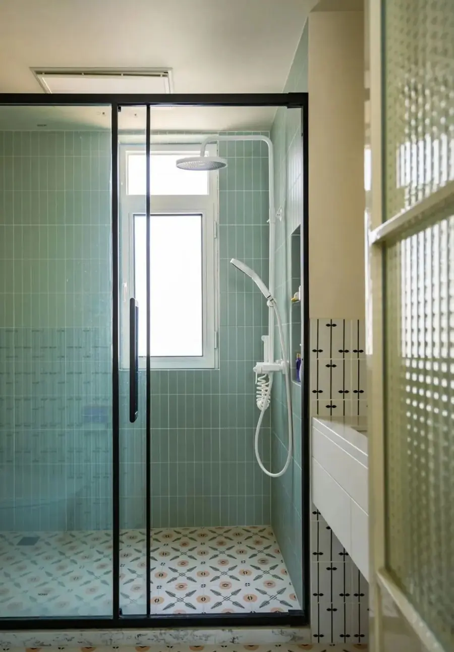 ▲ 主卫地砖也选用了花卉样式,配合蓝绿色调的淋浴区墙砖,跟整个房子的蓝绿色调进行统一