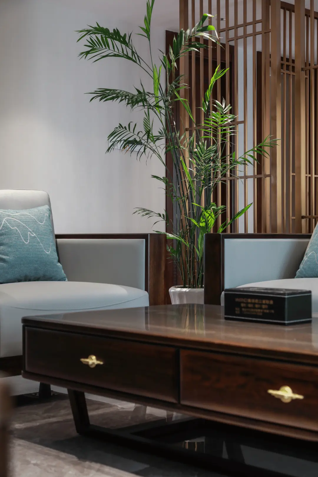 客厅宽阔明亮,对称式的布局方式将浓厚的文化氛围呈现于人前。设计师采用了大量的绿植点缀空间,绿植及木质家具,相得益彰,让空间多几分禅意。置身于此,仿佛与生活进行着一场惬意的对话。