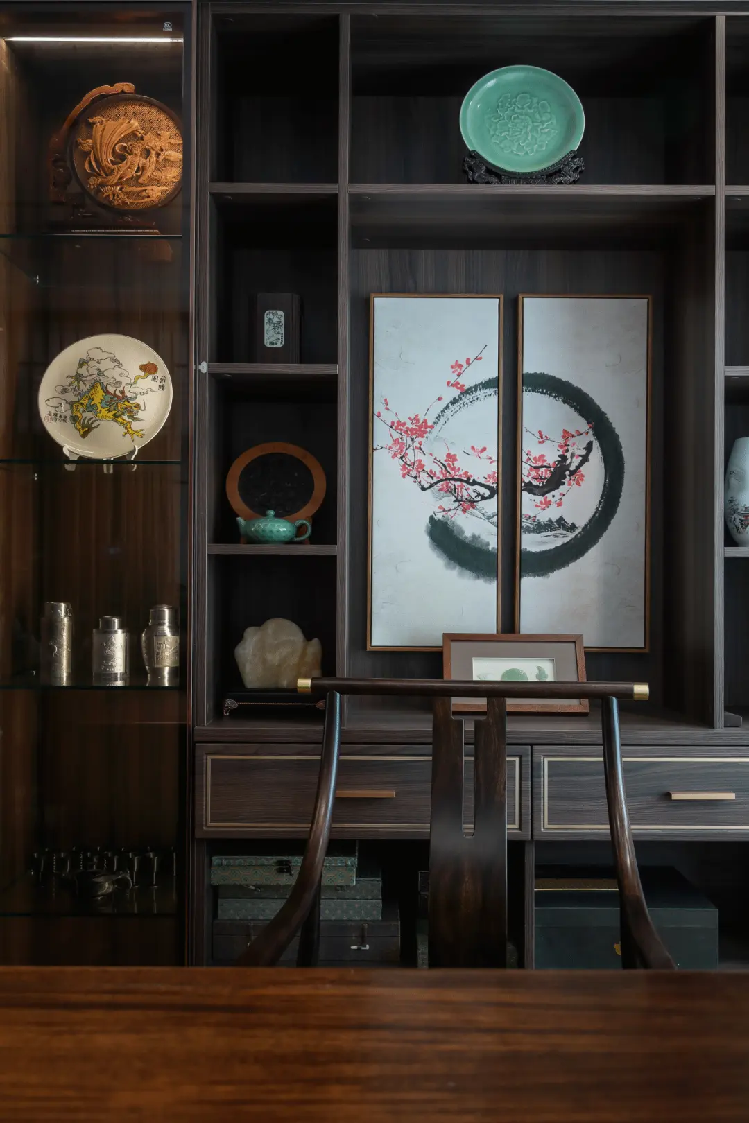 书房内,定制的书柜与墙面尺寸完美契合,既实用又大气典雅。书柜设计融入了中国传统元素,与室内陈设相得益彰。字画、盆栽、古玩等装饰品错落有致,共同营造出一种修身养性的生活境界。在这里,你可以尽享阅读的乐趣,感受文化的熏陶,让心灵得到真正的放松与升华。
