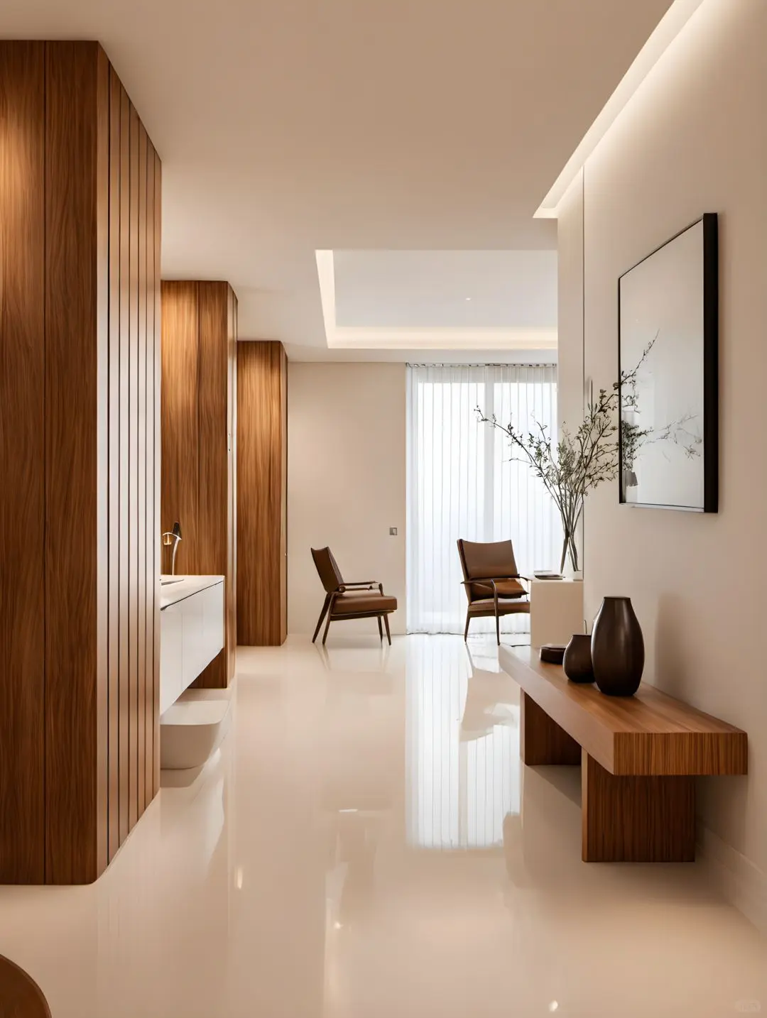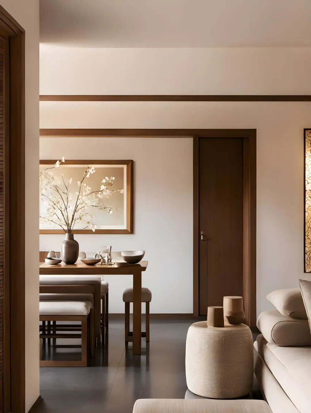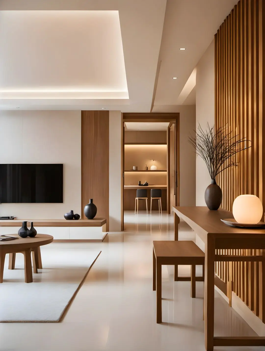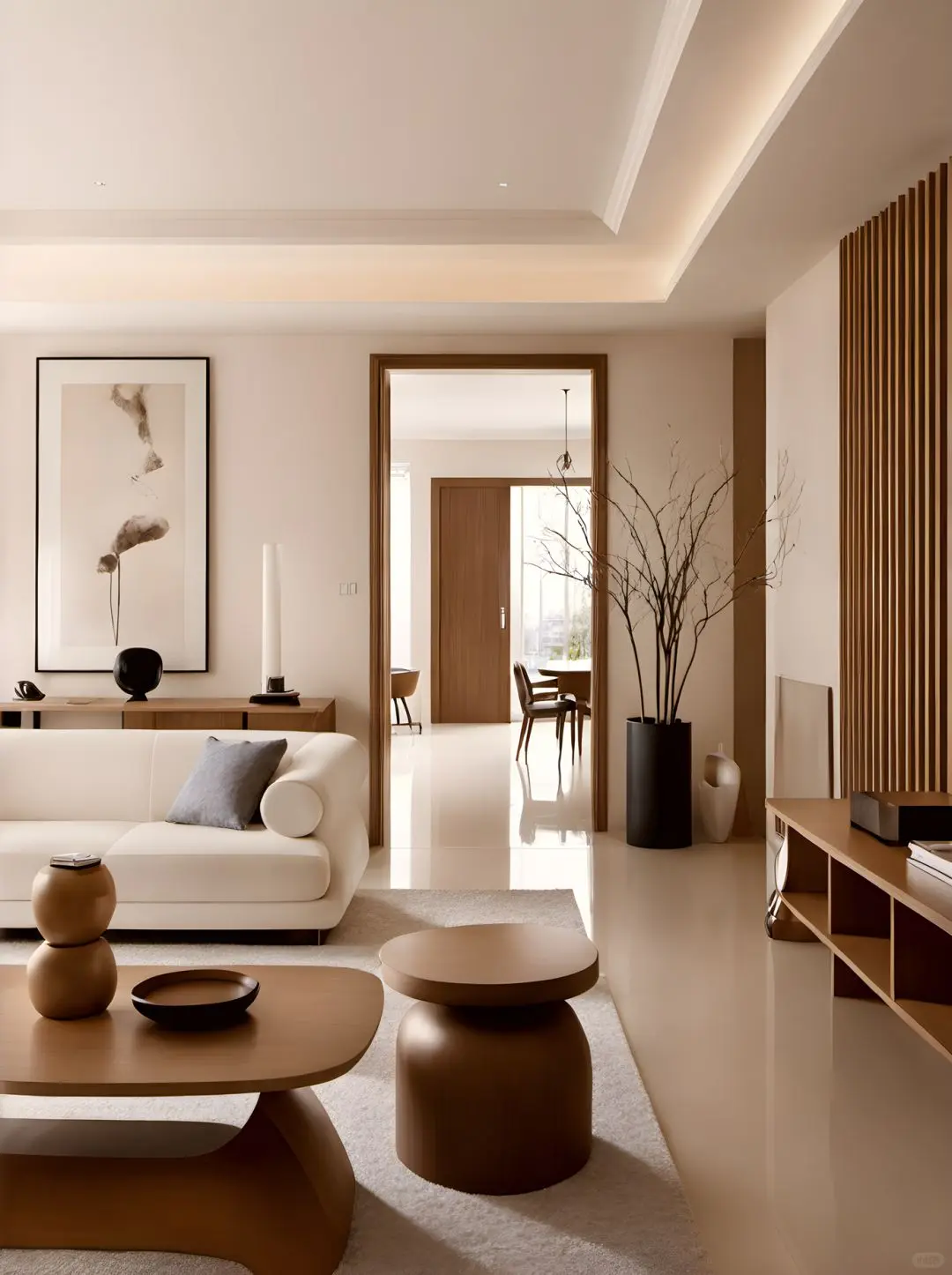客厅通铺米白色地砖,搭配浅色原木家具,干净典雅之中又带有稳重的质感,形成对比,