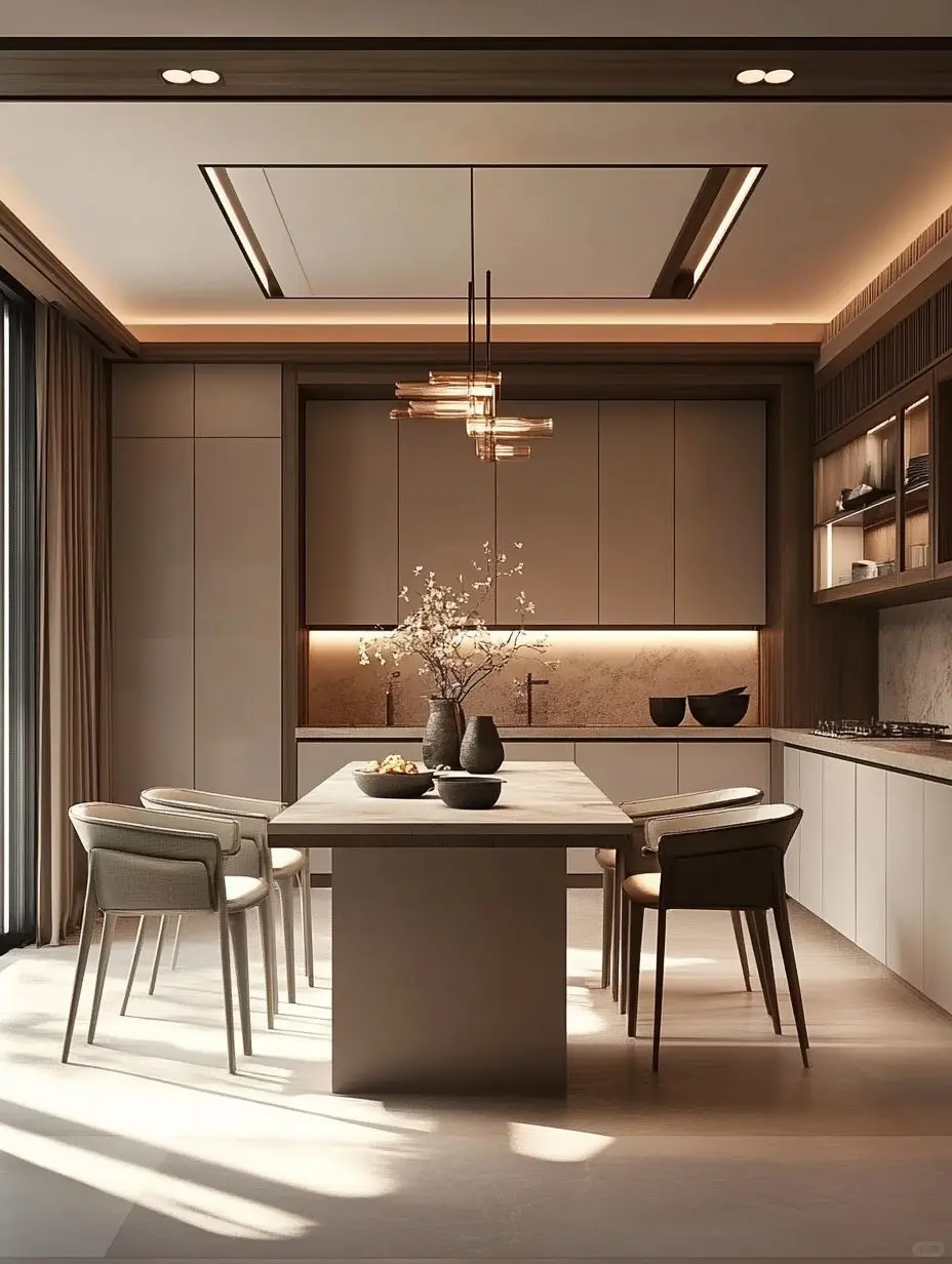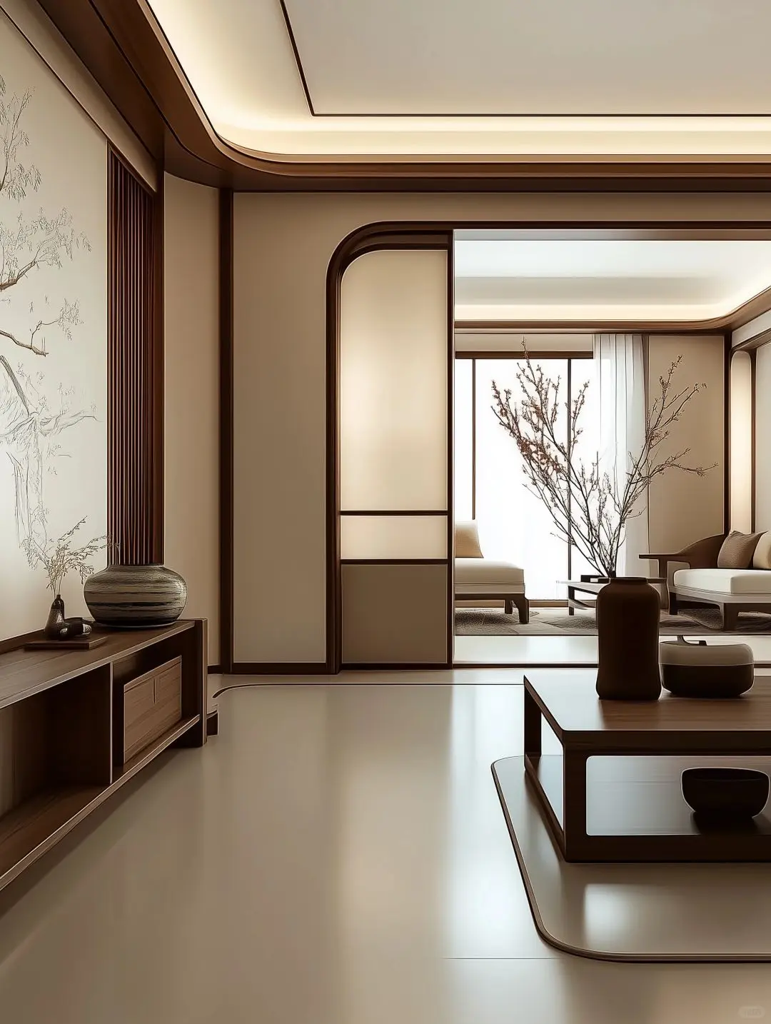 公共空间采用宋韵青石板瓷砖通铺,搭建出清雅大气的基调,搭配开放式格局,整个空间既通透又明亮,在现代的基础上,借鉴宋代艺术与文化元素,打造简素、雅致之美,使空间散发出浓郁的文化底蕴和历史沉淀感,从而提升了居住环境的艺术品位。