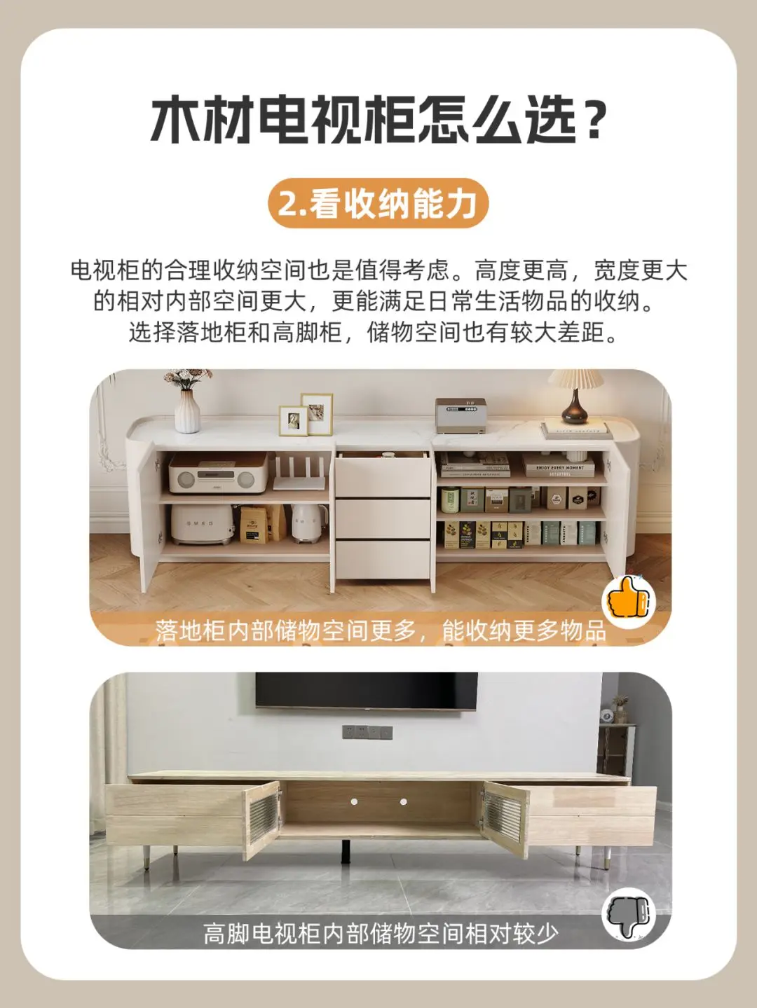 2️⃣ 看收纳能力!电视柜的收纳空间也是非常重要的!高度更高,宽度更大,内部空间就更大,能够满足日常生活物品的收纳需求!选择落地柜和悬空柜,储物空间也有较大差距哦!
