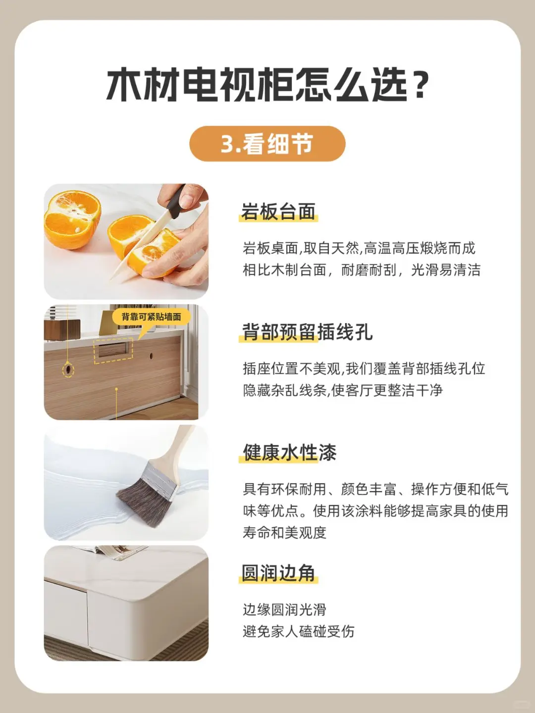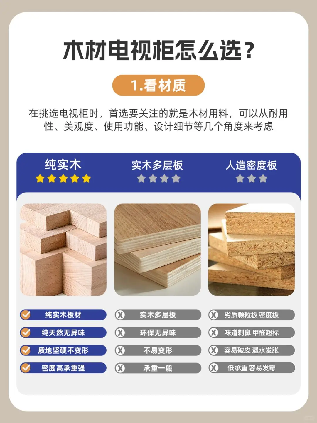1️⃣ 看材质!在挑选电视柜时,首要关注的是木材用料!从耐用性、美观度、使用功能和设计细节等多个角度来考虑哦!