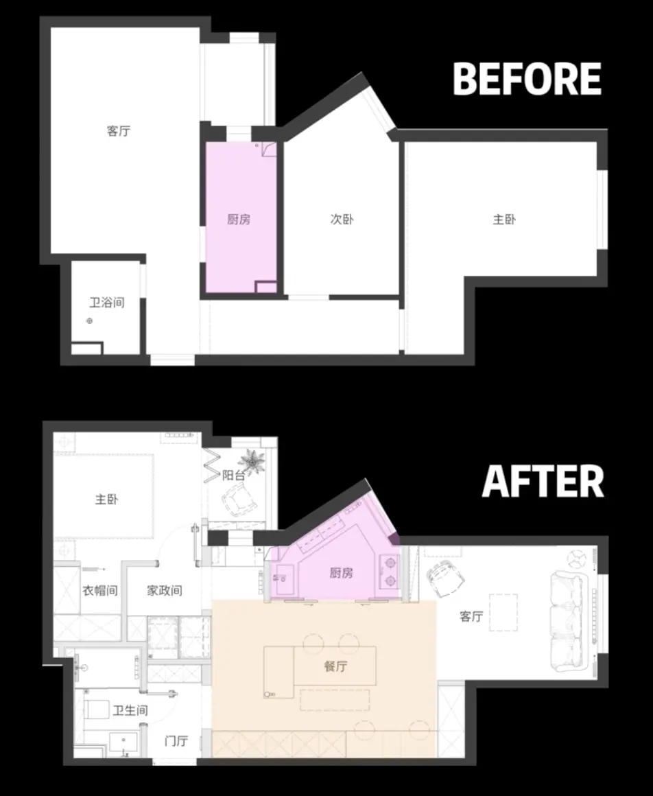 本次分享的是一套65㎡两居室改造案例,面对户型不规则、通透性差的挑战,设计师巧妙地将厨房移位至原次卧区域,并调换客厅与主卧位置,最大化利用南面采光,重塑宽敞明亮的公共空间。
