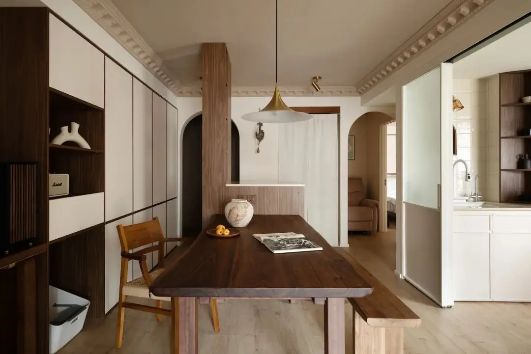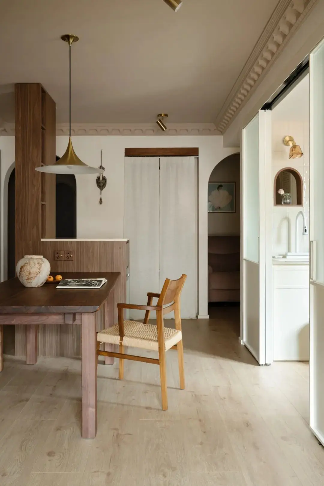 改造后的家,以柔和光线、弧形线条融合藤编、原木、黄铜及布艺等元素,营造出温馨、精致且浪漫宁静的居家氛围。