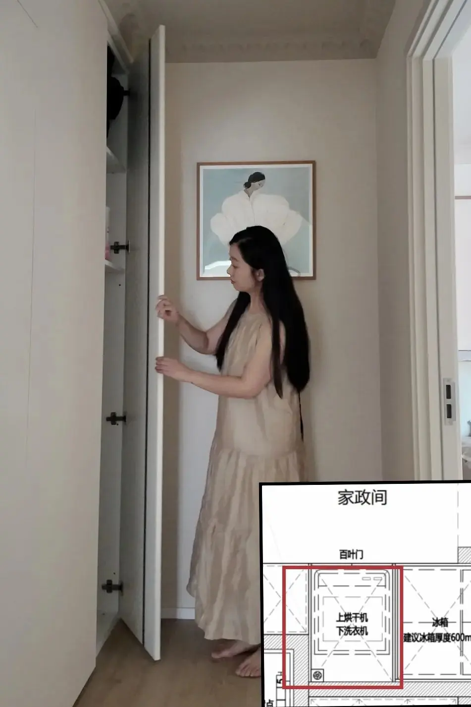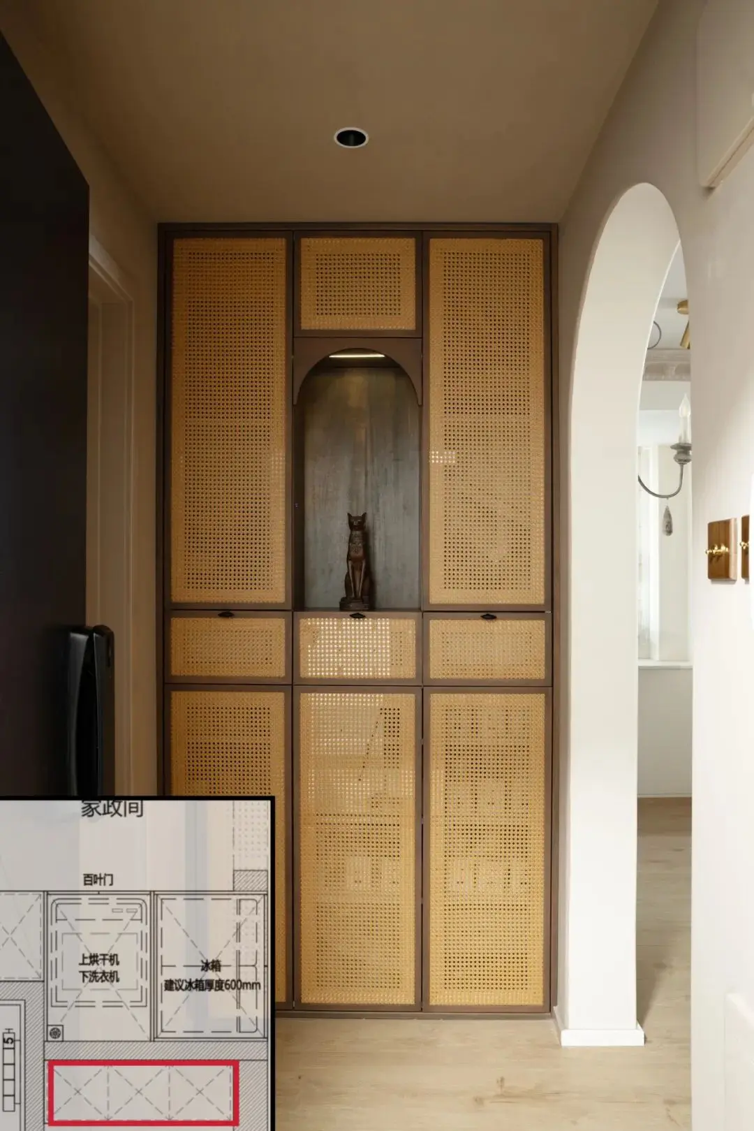 更具巧思的是,这面玄关柜的结构其实一个三面柜的功能:正面玄关柜,侧边冰箱嵌入区,背面洗衣机和洗护用品的收纳。