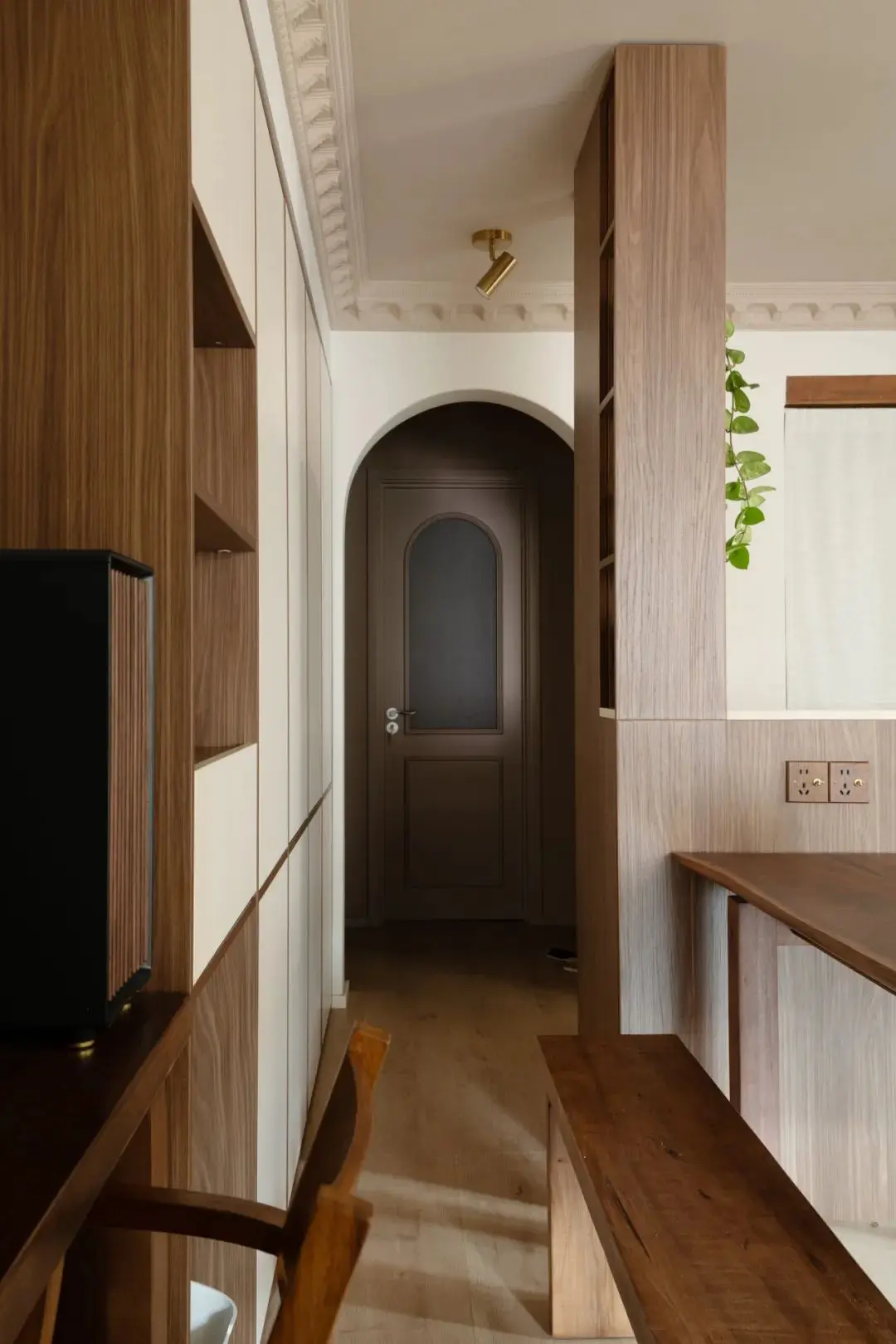 穿越拱形门,是颇具雅致的植物造景与具有沉静感的挂画,像是走进卧室的一种情绪转换。
